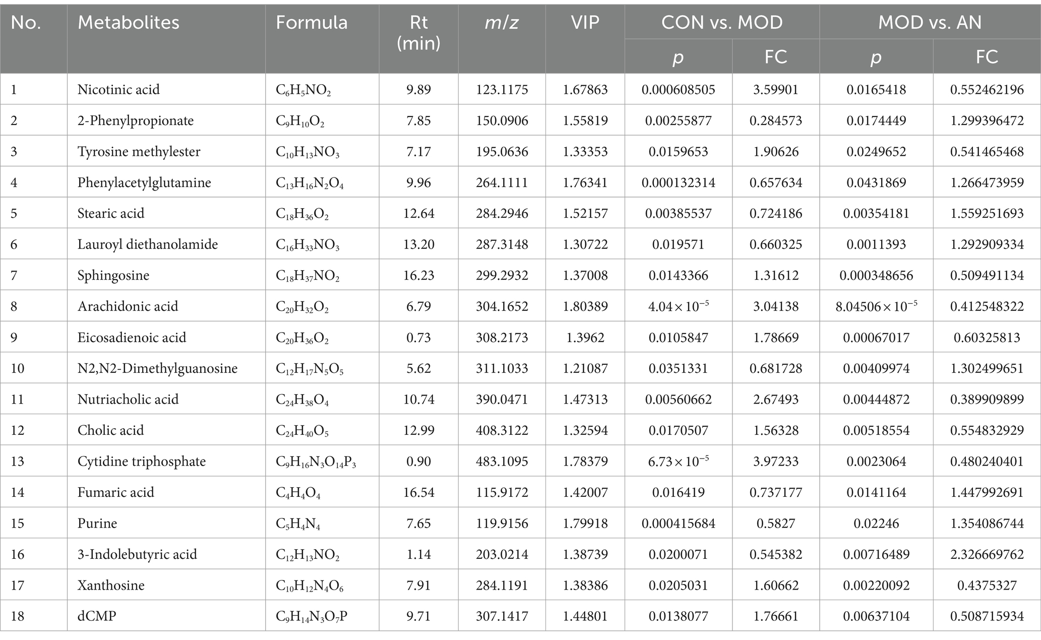 Based on VIP >1, p < 0.05, FC >1.2, or FC <0.8, common differential metabolites between the AN group and the CON or MOD groups, as well as between the SA group and the CON or MOD groups, were screened. The HMDB screening identified 18 differential metabolites between the AN and CON or MOD groups (Table 1), whereas 15 differential metabolites between the SA and CON or MOD groups (Table 2). Heatmap analysis was conducted to illustrate the expression of differential metabolites among the groups (Figures 5A,B), which revealed significant changes in metabolites between the CON and MOD groups, reversed by the AN and SA groups. In the CON, MOD, and AN groups, 18 metabolites were identified (Figures 6A–D). Compared to the CON group, nicotinic acid, tyrosine methylester, sphingosine, arachidonic acid, eicosadienoic acid, nutriacholic acid, cholic acid, cytidine triphosphate, xanthosine, and dCMP were significantly upregulated in the MOD group, while 2-phenylpropionate, phenylacetylglutamine, stearic acid, lauroyl diethanolamide, N2,N2-dimethylguanosine, fumaric acid, purine, and 3-indolebutyric acid were downregulated.