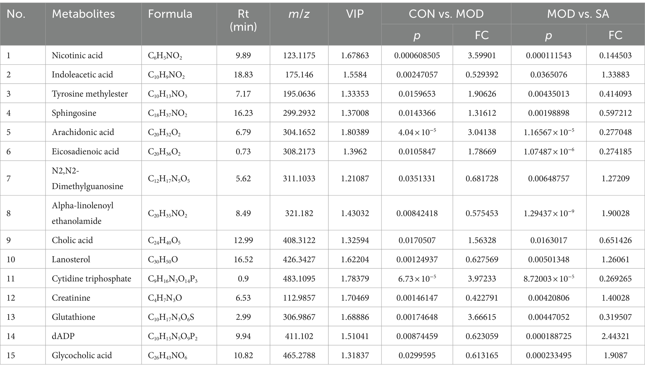 Volcano plots were utilized to visualize differential metabolites between the groups in positive and negative ion modes. Compared with the CON rat, the MOD rat’s fecal samples indicated 407 upregulated and 548 downregulated metabolites in positive ion mode and 347 upregulated and 1994 downregulated metabolites in negative ion mode (Supplementary Figures S6A-F). Furthermore, compared to the MOD group, the AN group had 395 upregulated and 445 downregulated metabolites in positive ion mode and 88 upregulated and 3,060 downregulated metabolites in negative ion mode. In addition, the SA group exhibited 338 upregulated and 642 downregulated metabolites in positive ion mode and 188 upregulated and 3,218 downregulated metabolites in negative ion mode.