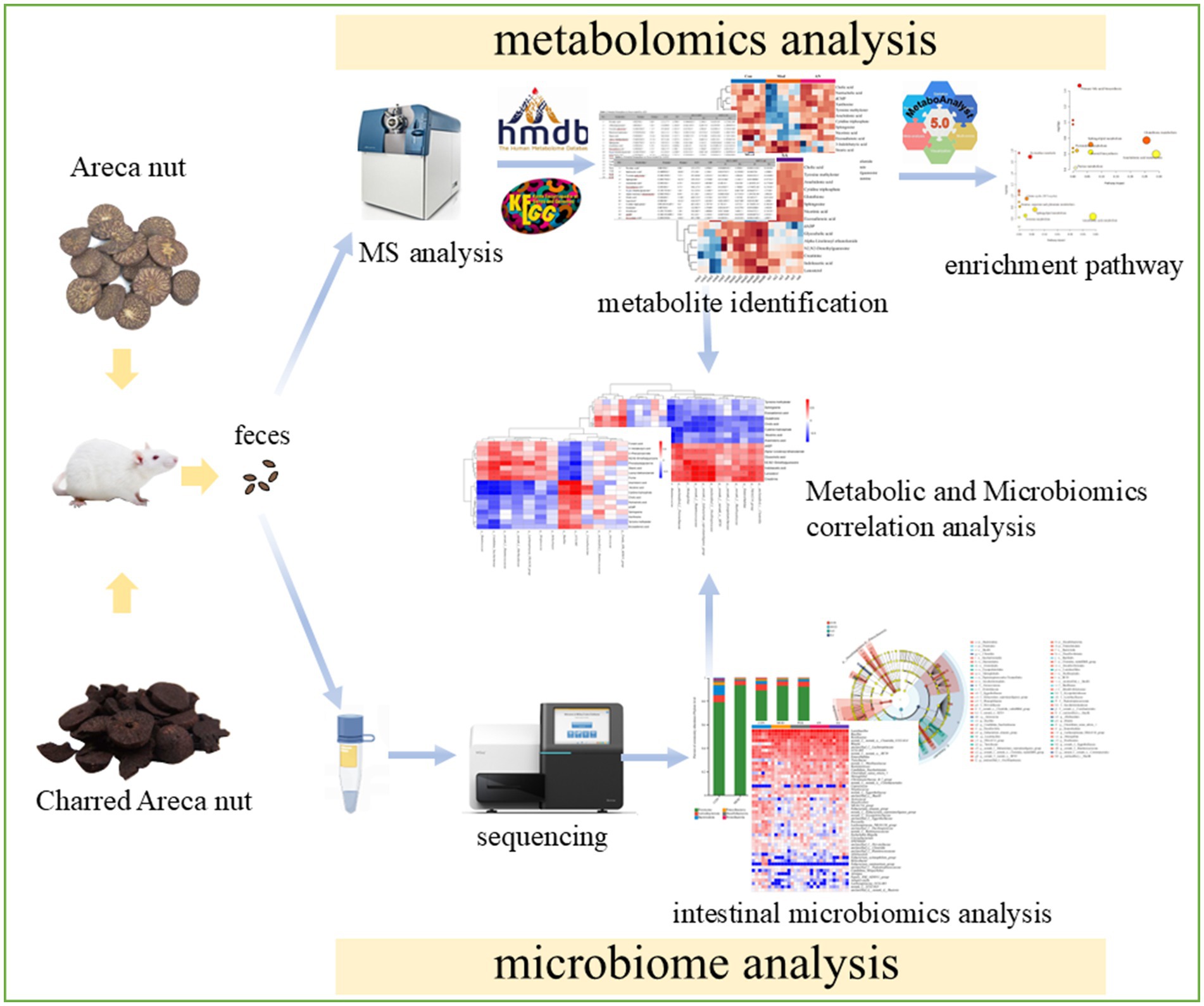AN, Areca nut; CAN, Charred areca nut; GI, Gastrointestinal; CON, Control; MOD, Constipation model; POS, Positive drug; HE, Hematoxylin and eosin; MTL, Motilin; VIP, Vasoactive intestinal peptide; SP, Substance P; ACH, Acetylcholine; NMDS, Non-metric multidimensional scaling analysis; LEfSe, Linear discriminant analysis Effect Size; LDA, Linear discriminant analysis; F/B, Firmicutes/Bacteroidetes; UHPLC-QTOF-MS, Ultra-high-performance liquid chromatography-quadrupole time-of-flight mass spectrometry; PCA, Principal component analysis; OPLS-DA, Orthogonal partial least squares discriminant analysis.