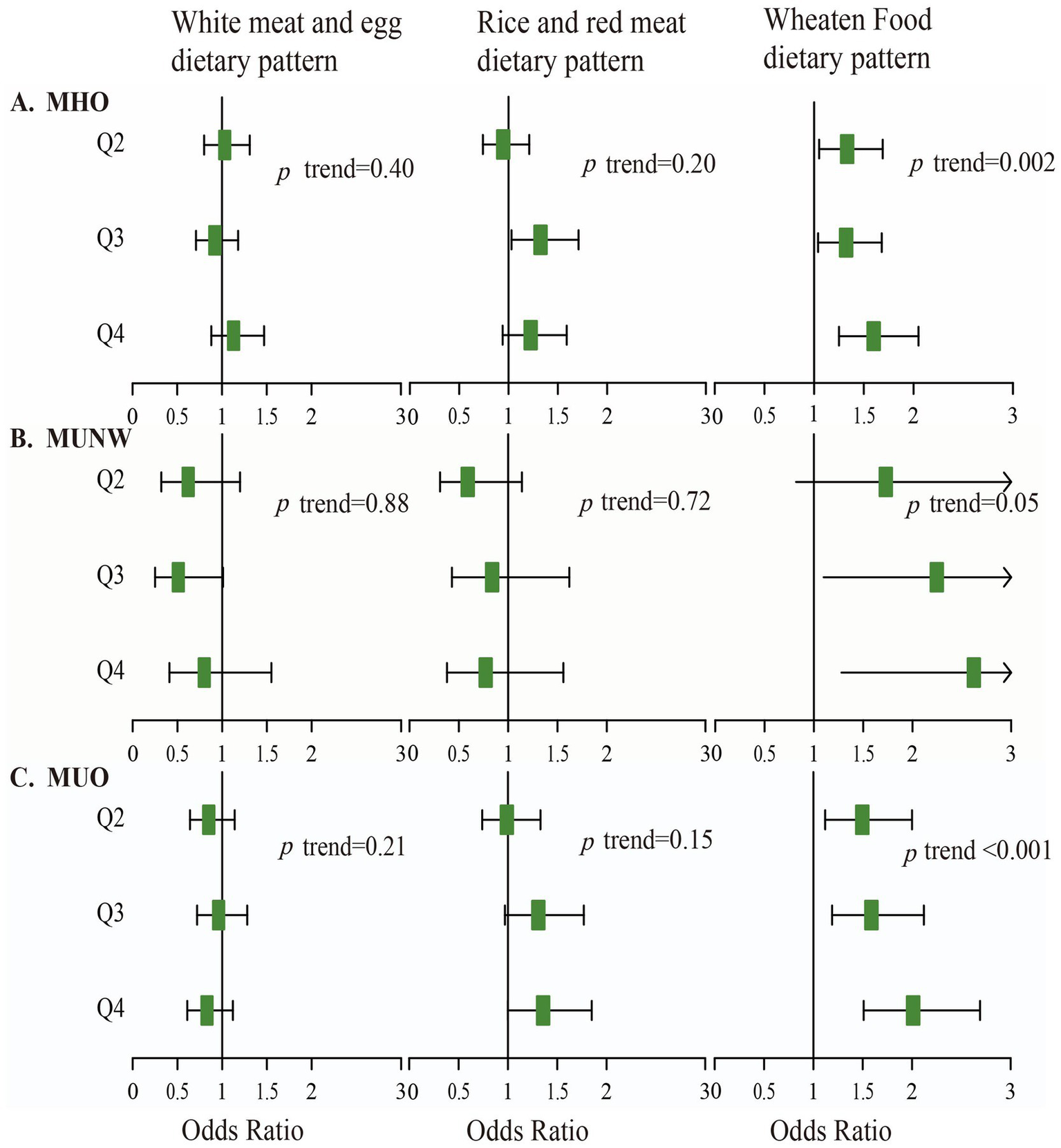 Three major dietary patterns were identified. The participants who followed the wheaten food dietary pattern had a higher likelihood of having metabolically normal obesity (MHO) (odds ratio (OR) 1.05, 95% confidence interval (CI) 1.02–1.08), metabolically abnormal normal weight (MUNW) (OR 1.08, 95%CI 1.00–1.16), and metabolically abnormal obesity (MUO) (OR 1.07, 95%CI 1.04–1.11). Specifically, those with the highest wheaten food dietary pattern were 1.60 times more likely to have MHO (OR 1.60, 95%CI 1.25–2.05), 2.62 times more likely to have MUNW (OR 2.62, 95%CI 1.28–5.37), and 2.01 times more likely to have MUO (OR 2.01, 95%CI 1.51–2.69) than those with the lowest wheaten food dietary pattern.