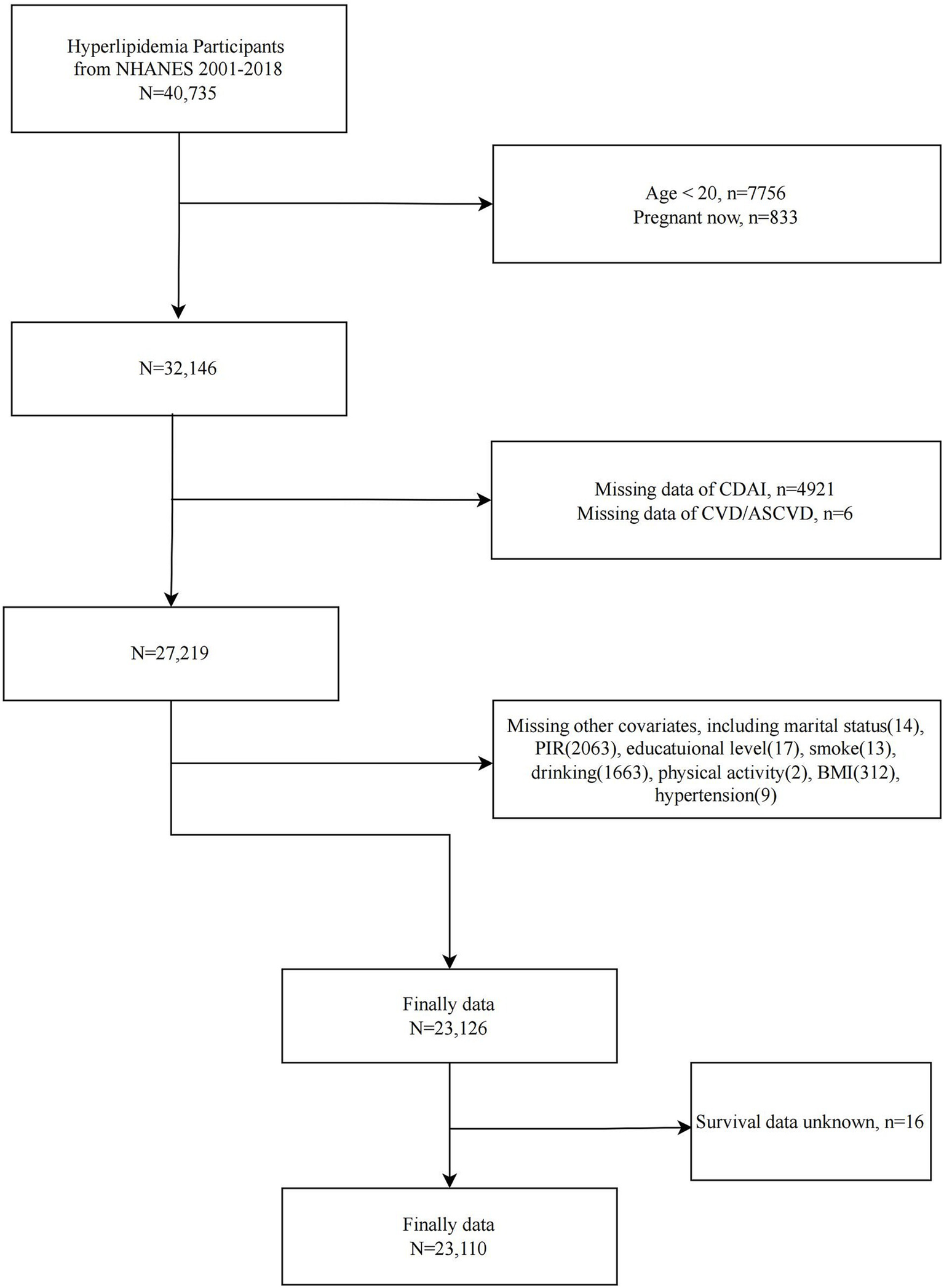 NHANES is the primary epidemiologic program under the responsibility of the National Center for Health Statistics (NCHS), assessing the health and nutritional status of the U.S. ambulatory population. Since 1999, NHANES has collected relevant data continuously in two-year cycles. NHANES is a series of national, population-based, cross-sectional studies characterized by a complex, stratified, multistage probability cluster sampling design. The survey protocols for all NHANES waves were approved by the NCHS Ethics Review Board, and all participants provided written informed consent. We included 40,735 participants with dyslipidemia from nine consecutive cycles of NHANES (2001–2018). We then sequentially excluded participants <20 years of age (n = 7,756), pregnant (n = 833), missing CDAI data (n = 4,921), missing CVD/ASCVD information (n = 6), and missing covariates (n = 4,083). A total of 23,126 participants with dyslipidemia were included in the analysis of the between CDAI and CVD/ASCVD. In addition, after excluding participants with missing survival information, 23,110 participants were included in the analysis of the association between CDAI and CVD mortality (Figure 1).