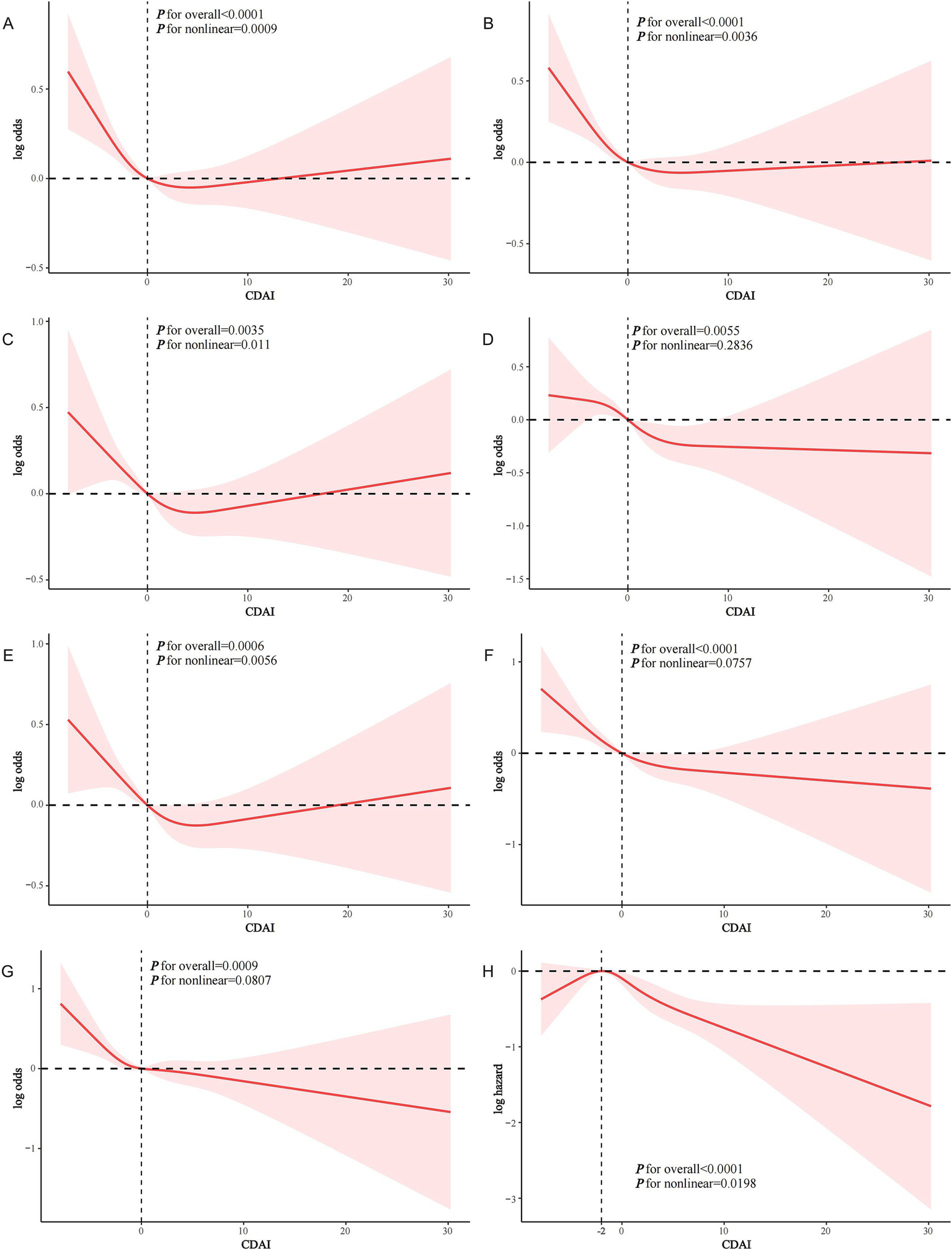 Figure 2. RCS analysis of the association of CDAI with CVD events in people with dyslipidemia. (A) CDAI and CVD; (B) CDAI and ASCVD; (C) CDAI and CHD; (D) CDAI and CHF; (E) CDAI and heart attack; (F) CDAI and stroke; (G) CDAI and angina; (H) CDAI and CVD mortality.
