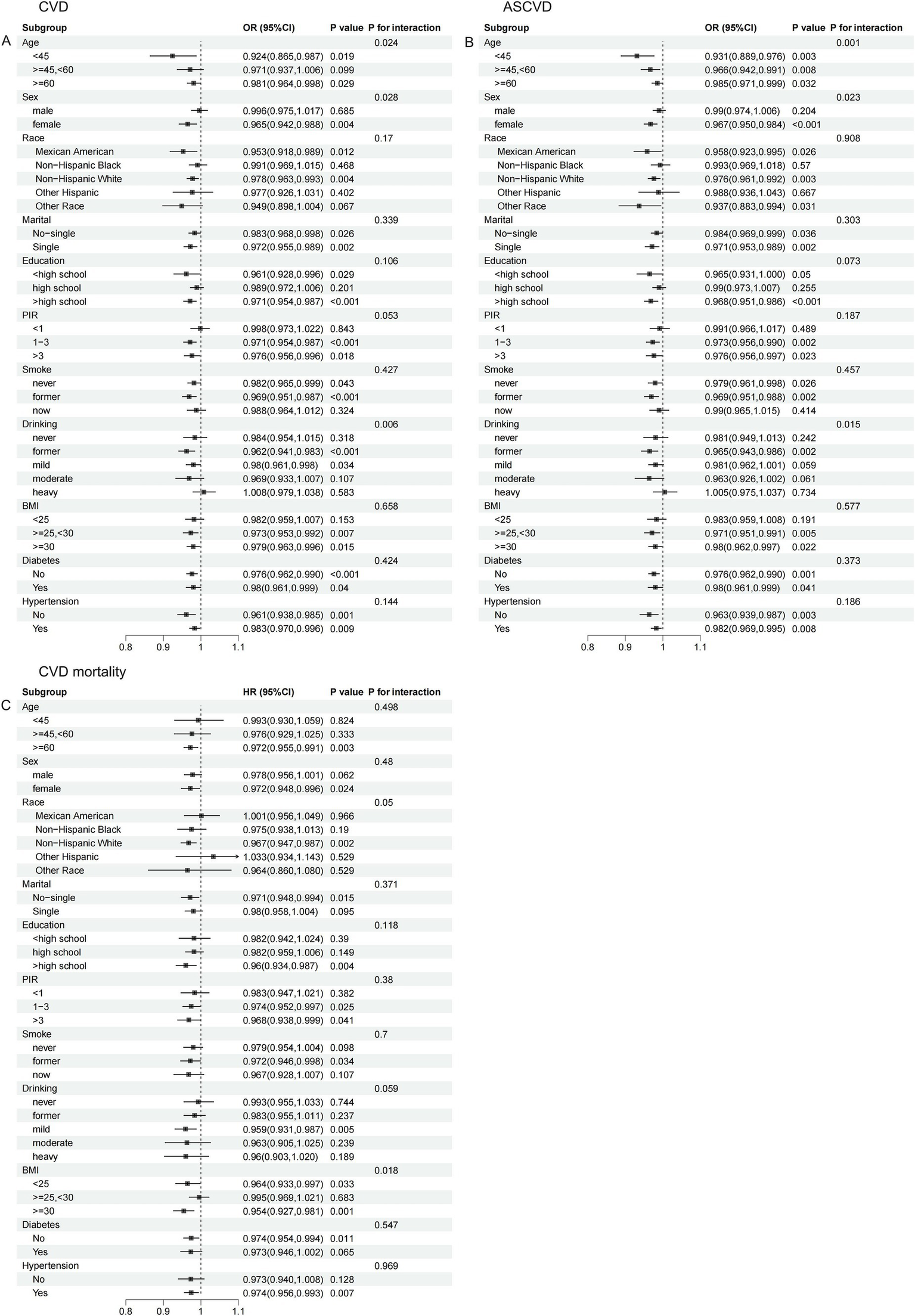Interaction analyses showed that age, sex, and alcohol consumption all significantly influenced the association of CDAI with the prevalence of CVD (Figure 4A) and ASCVD (Figure 4B) in dyslipidemia populations (p for interaction all <0.05). These effects were particularly pronounced in those <45 years, females, and former drinkers. Additionally, BMI significantly modified the association between CDAI and CVD mortality (p for interaction = 0.018), with a stronger association observed in those with a BMI ≥30 kg/m2 (Figure 4C).