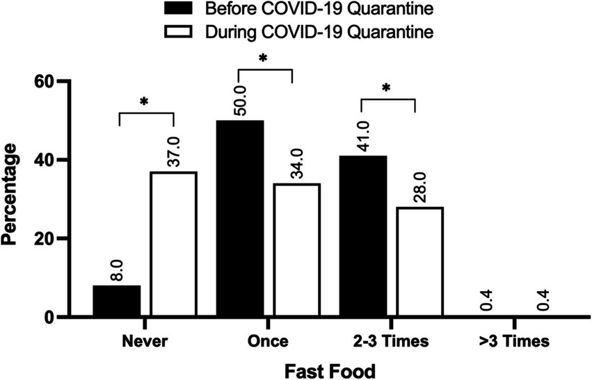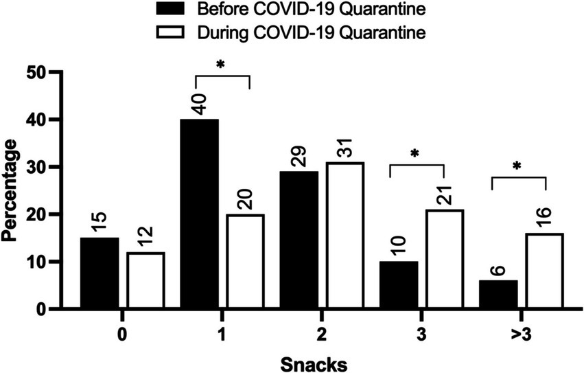 The frequency of snack consumption before and during the COVID-19 lockdown. The values are expressed as the percentage of participants. N = 238. *Indicates significance at p < 0.05.