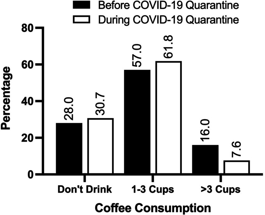 The number of participants who considered lunch as their primary meal significantly decreased (p < 0.001) during the COVID-19 lockdown (74%), compared to before it (86%). By contrast, the number of participants who considered dinner as their primary meal remained almost unchanged (p = 0.079) during (79.1%) and before (84.1%) the lockdown. However, snack consumption significantly increased (p < 0.001) while fast-food consumption significantly decreased (p < 0.01) during the lockdown period. Our results also revealed a significant increase (p < 0.01) in water and coffee intake during the lockdown, with a significant rise in dessert consumption (p < 0.01).