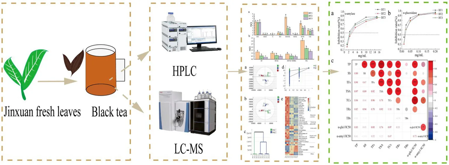 Black tea, the most widely consumed tea globally (1), undergoes a unique fermentation process during which catechin-based polyphenols are enzymatically oxidized by polyphenol oxidase (PPO) and peroxidase (POD). This oxidation leads to the gradual formation of theaflavins (TFs), theasinesins (TSs), thearubigins (TRs), and theabrownins (TBs) (2–4). Tea pigments, including TFs, TRs, and TSs, are critical determinants of black tea’s color and taste (5, 6) and exhibit diverse biological activities, including hypoglycemic and hypolipidemic effects (7–9). Theasinesins, particularly theasinesin A (TSA), theasinesin B, and theasinesin C, also significantly influence the color and taste of black tea (2, 10). Furthermore, the inhibition of digestive enzymes and the modulation of blood glucose levels have emerged as significant areas of research in recent years (9, 11, 12).