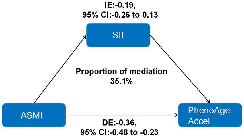 The analysis included 7,440 participants from the NHANES 2011–2018. Phenotypic Age Acceleration (PhenoAgeAccel) was calculated as the residuals from regressing PhenoAge on chronological age. Multivariable linear regression analyses were performed to assess the association between ASMI and PhenoAgeAccel. Mediation analysis was conducted to quantify the extent to which systemic inflammation contributes to this association.