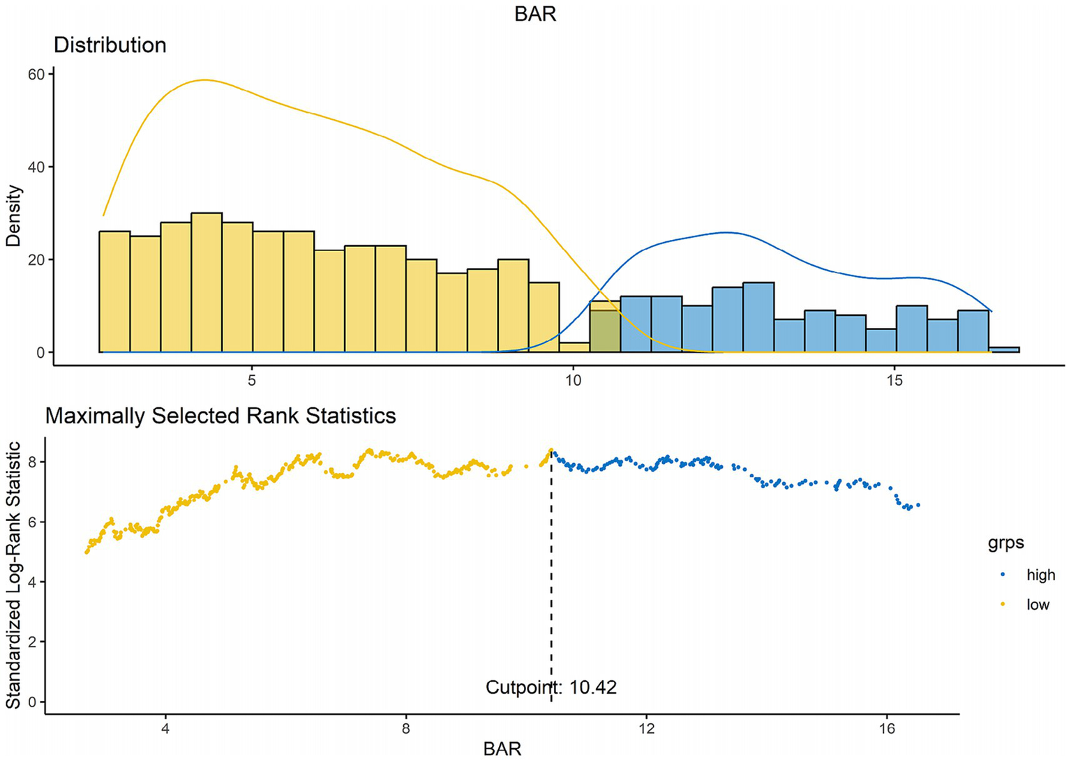 Group variations were assessed with t- or Mann–Whitney U-tests, and continuous variables were represented as medians with interquartile ranges (IQR). Categorical variables were represented as counts and percentages, thereafter compared with the Chi-square or Fisher’s exact tests. The ideal BAR cutoff value in forecasting ACM was established by maximum chosen rank statistics, yielding a threshold of 10.42. This cutoff divided the BAR into two categories: less than 10.42 and greater than or equal to 10.42, optimizing the risk ratio (Figure 2).