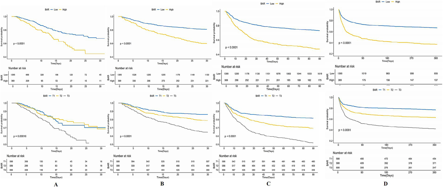 Figure 3. Kaplan–Meier (KM) survival analysis curves for (A) ICU, (B) 30-day, (C) 90-day, and (D) 365-day ACM allocated by binary and tertiles of BAR pre-PSM.