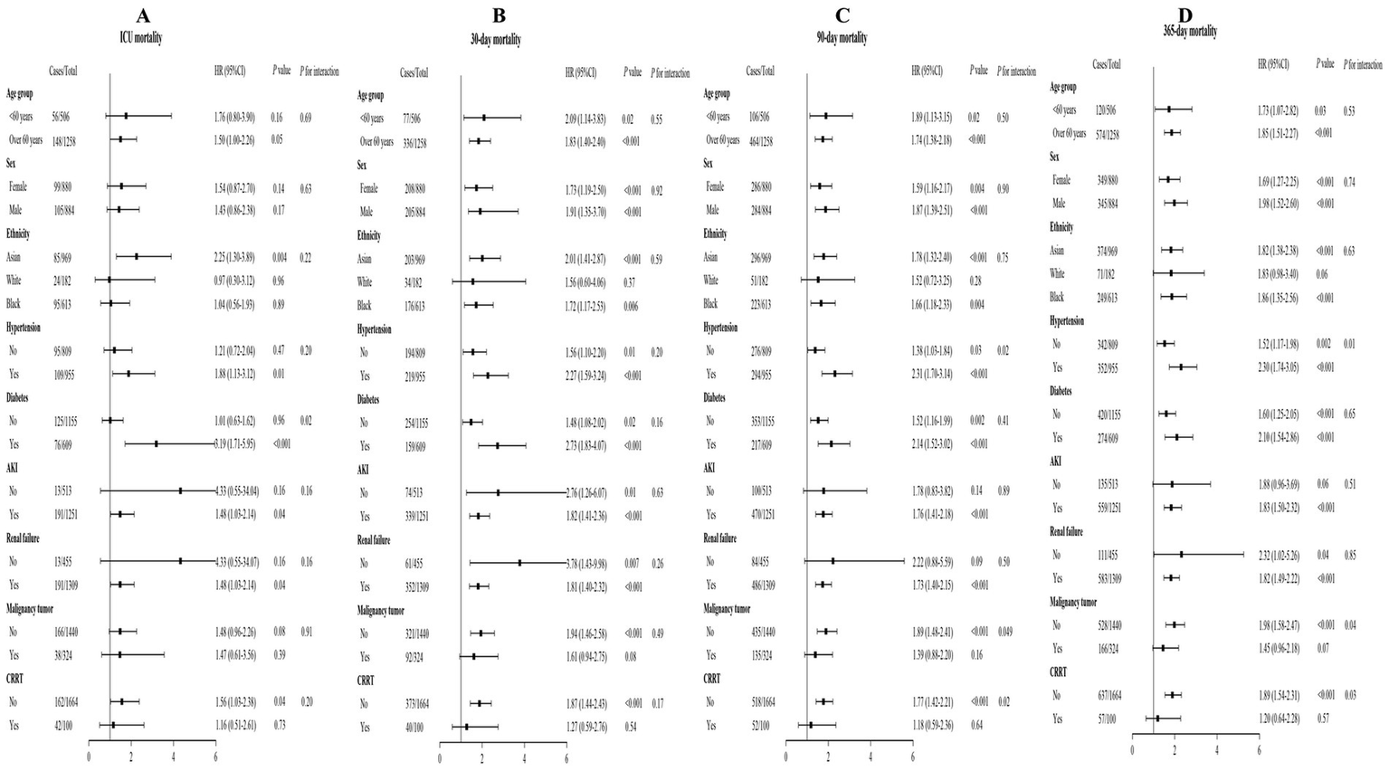 Subgroup studies were conducted to ascertain the BAR influence on short- and long-term ACM in AIS patients. The investigations were allocated based on demographic and clinical variables, encompassing age (<60 and ≥60 years), gender, race/ethnicity, the existence of HTN, DM, AKI, RF, CRRT, and malignancy tumor. The findings consistently indicated that a greater BAR correlated with elevated risks of short- and long-term ACM across the majority of investigated subgroups (Figure 6). The correlation between an elevated BAR and heightened ICU ACM lacking significance in the White (p = 0.96) and Black (p = 0.89) subgroups, nor among patients without HTN (p = 0.47), DM (p = 0.96), AKI (p = 0.16), and RF (p = 0.16). A significant association between elevated BAR and heightened ICU ACM was mostly found in the Asian (p = 0.004), HTN (p = 0.01), DM (p < 0.001), AKI (p = 0.04), RF (p = 0.04), and non-CRRT (p = 0.04) subgroups. Analyses of interactions indicated no significant impacts on short- and long-term ACM across the majority of subgroups. Discrepancies were reported in the DM subgroup during the ICU stay (Pfor interaction = 0.02), in the HTN and CRRT subgroups at the 90-day and 365-day intervals (all Pfor interaction < 0.05), and in the malignancy tumor subgroup at the 365-day intervals (Pfor interaction = 0.04), indicating that the link between BAR and mortality may vary in these particular cohorts.