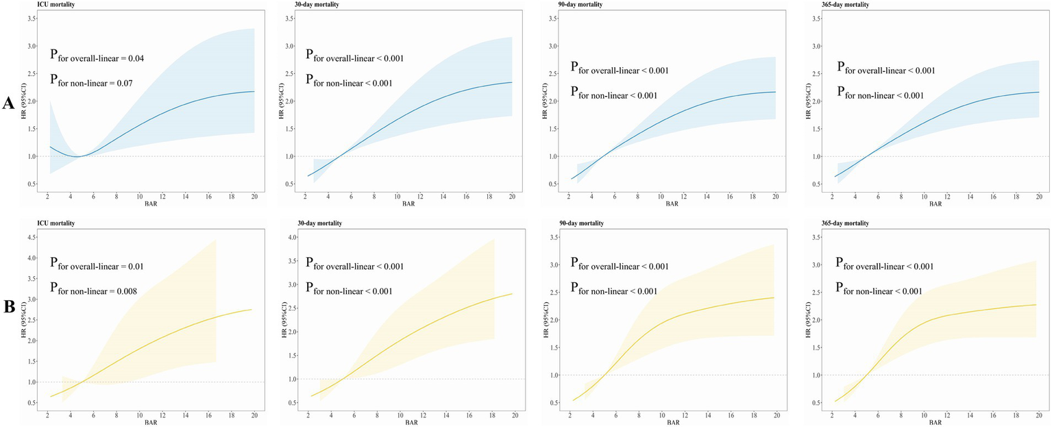 Results: Prior to PSM, we incorporated 1,764 suitable subjects with a median BAR of 5.52 mg/g. This cohort was composed of 1,395 and 369 patients in the BAR <10.42 and ≥10.42 groups, respectively. The ICU ACM rates were 9.53 and 19.24% (p < 0.001), respectively, while the 30-day ACM rates were 19.00 and 40.11% (p < 0.001). The 90- and 365-day ACM rates were 26.95 and 52.57% (p < 0.001), and 33.12 and 62.87%, respectively (p < 0.001). After fully adjustment, MCR models indicated a heightened mortality risk for the ICU (hazard ratio [HR] = 1.55, 95% confidence interval [CI]: 1.08–2.22; p = 0.02), 30-day (HR = 1.87, 95% CI: 1.46–2.38; p < 0.001), 90-day (HR = 1.75, 95% CI: 1.42–2.15; p < 0.001), and 365-day (HR = 1.81, 95% CI: 1.50–2.19; p < 0.001) in the high BAR group as opposed to the low BAR group. Following PSM, the analysis included 352 matched patient pairs, revealing persistent links between the higher BAR group and increased ACM risk throughout ICU, 30-, 90-, and 365-day intervals. Subsequent RCS studies before and after PSM highlighted a positive non-linear correlation between BAR and ACM in the short and long-term. In the subgroup investigation of ICU ACM, a subgroup of diabetes had an interaction effect (Pfor interaction = 0.02). In the subgroup analysis of 90-day ACM, subgroups of hypertension and CRRT had an interaction effect (all Pfor interaction < 0.05). In the subgroup analysis of 365-day ACM, subgroups of HTN, CRRT, and malignancy tumor had an interaction effect (all Pfor interaction < 0.05).