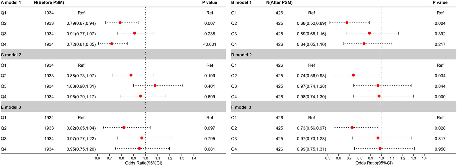 To reduce confounding bias, we performed PSM processing based on UUI results. To ensure that the distribution of covariates was comparable between the UUI and non-UUI groups, we matched for the following factors: age, smoking, alcohol consumption, diabetes, hypertension, and total cholesterol (36–40). Propensity score matching (PSM) was carried out 1:1 using the R Software “MatchIt” program. The sample population was re-examined after PSM in order to validate the findings.