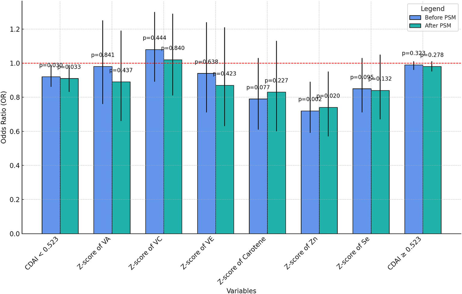 We used the average of two measurements to minimize bias and increase the reliability of the results. A modified version developed by previous researchers was utilized to calculate each participant’s CDAI (31). Zinc, selenium, carotenoids, and vitamins A, C, and E are the six dietary antioxidants that make up CDAI. We standardized each micronutrient by subtracting the mean of the six dietary vitamins and minerals and dividing by the total standard deviation to calculate a Z-score. Their Z-scores were then summed to obtain the composite value of CDAI. The following is the calculating formula:
