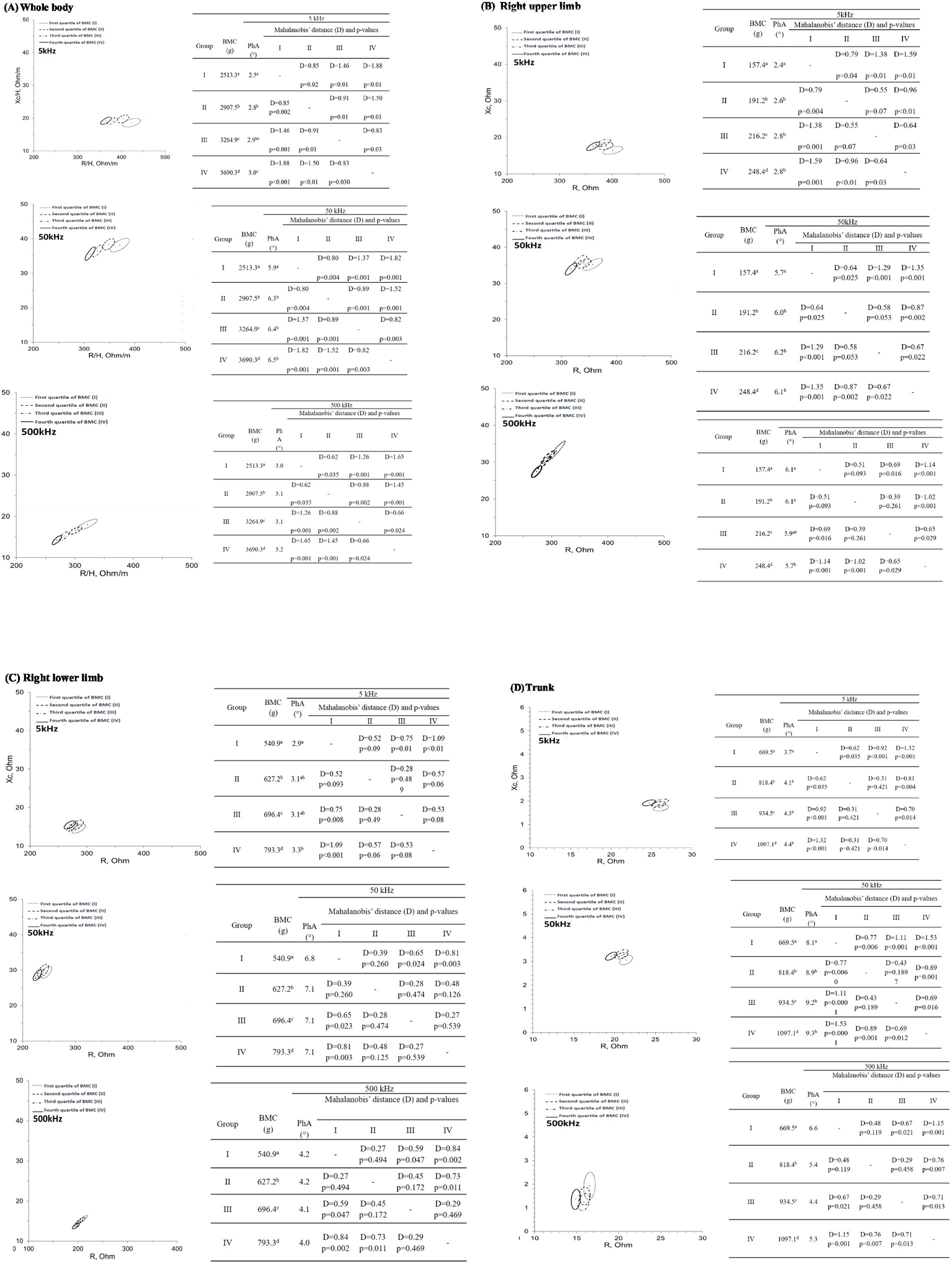 BIVA 95% confidence ellipses were drawn in R-Xc graphs in order to compare quartiles of BMC, using Mahalanobis’ distance (D), and to verify whether R, Xc and PhA could differentiate BMC in whole-body and segments.