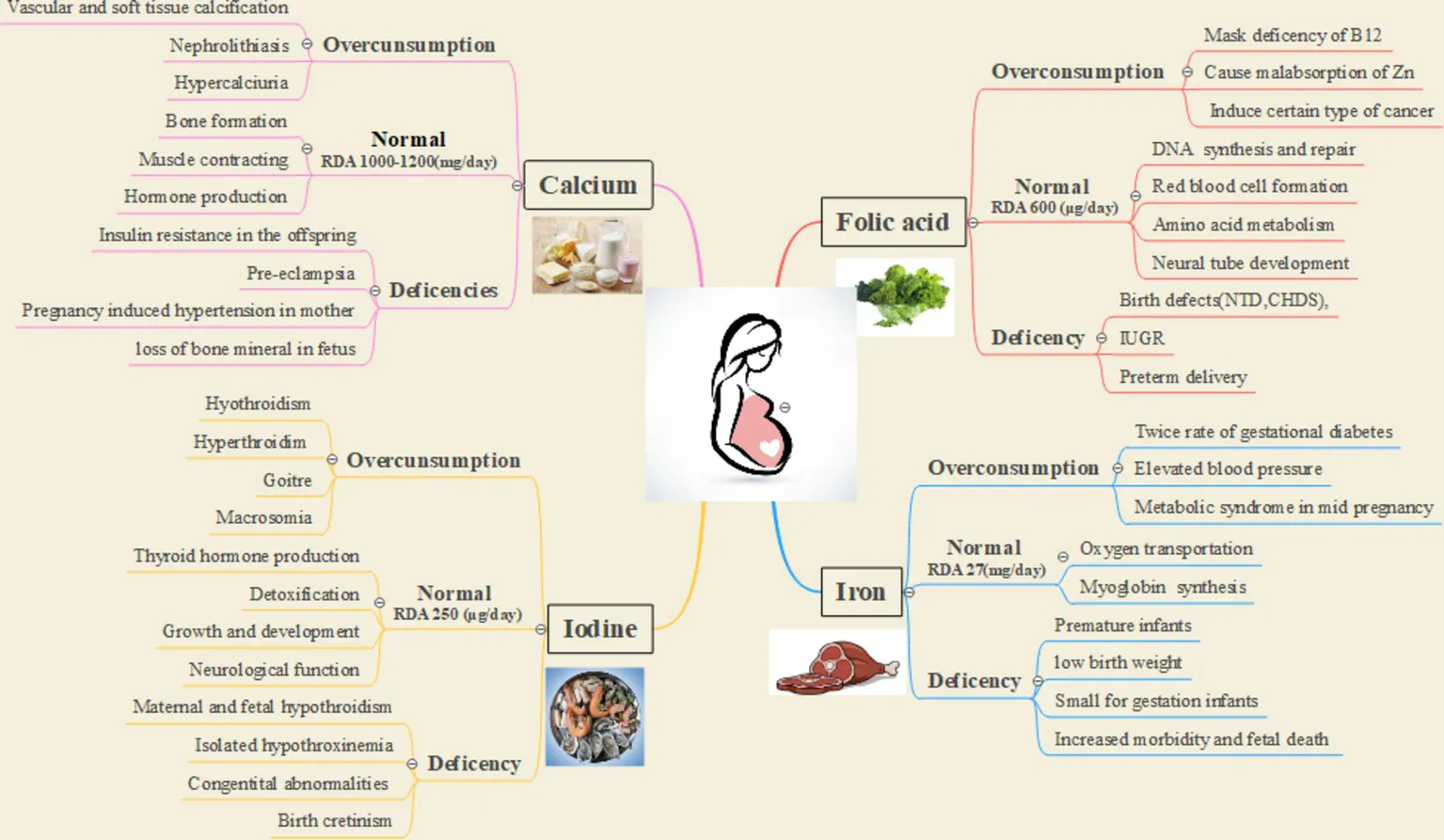 Keeping in view the above-given importance of these micronutrients, it is critical to have a deeper understanding of pregnancy nutritional requirements. Therefore, this review provides insights into sources, bioavailability, Recommended Dietary Allowance (RDA), causes and consequences of deficiency, and the need for supplementation while considering the danger of micronutrient overload of the four most vital nutrients during pregnancy: iron, folic acid, iodine, and calcium to assess and improve pregnant women’s health status.