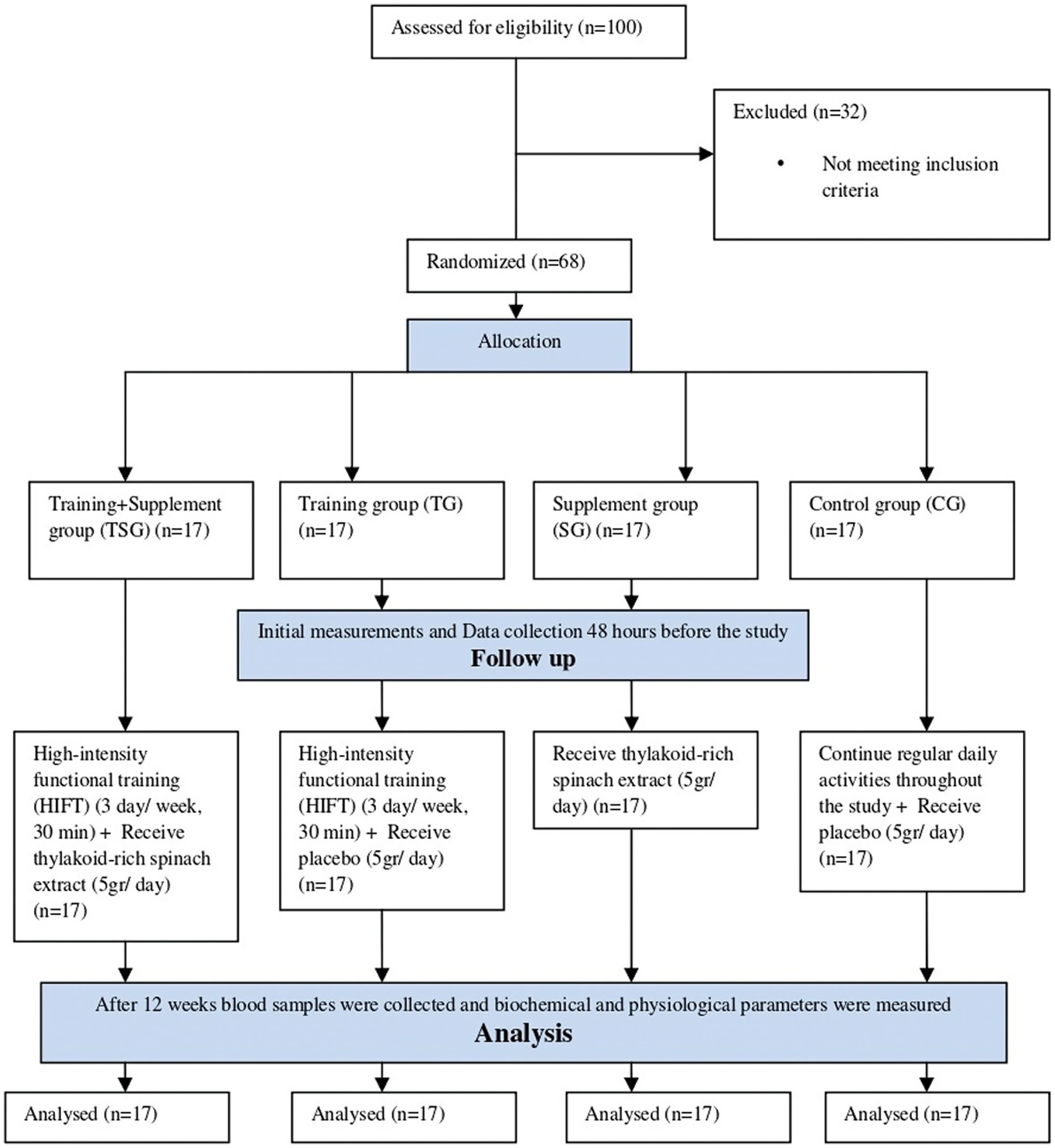 However, 8 participants withdrew during the study due to reasons such as poor physical fitness, joint weakness, and others, resulting in 15 participants in each group. The sample size was calculated a priori based on detecting a clinically meaningful difference in adiponectin levels. Assuming an effect size (Cohen’s d) of 0.8 for adiponectin, with an alpha level of 0.05 and a power of 90%, it was determined that 14 participants per group would be required. Allowing for a potential dropout rate of 20%, we aimed to recruit 17 participants per group, totaling 68 participants. After baseline measurements, the HIFT group commenced the 12-week training program (3 sessions per week), the Thyl group initiated the 12-week supplementation intervention, and the HFT + Thyl group commenced both training and supplementation. The control group maintained their existing lifestyles throughout the 12-week of research.