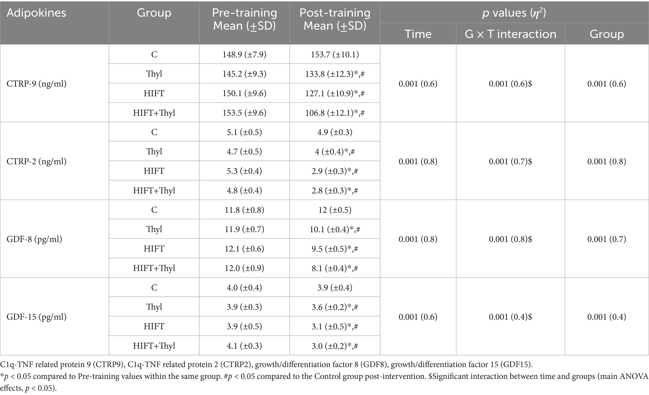 Plasma adipokines variables showed significant group x time interactions for CTRP-9 (η2 = 0.6, p < 0.001), CTRP-2 (η2 = 0.7, p < 0.001), GDF-8 (η2 = 0.8, p < 0.001) and GDF-15 (η2 = 0.4, p < 0.001) (Table 1). Within-group analysis revealed that levels of CTRP-2, CTRP-9, GDF-8, and GDF-15 significantly decreased in the HIFT and HIFT+Thyl groups (all p < 0.05), but not in the control group (all p > 0.05). The Thyl group also showed significant decreases in CTRP-2, CTRP-9, GDF-8, and GDF-15 (all p < 0.05).