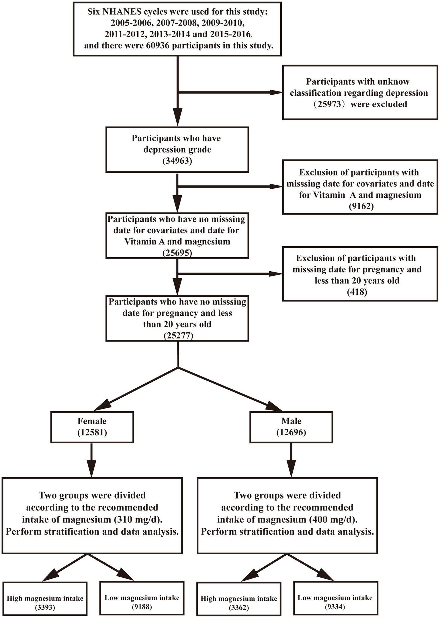 Data for this study were derived from the National Health and Nutrition Examination Survey (NHANES). NHANES database, known for its large sample size, robust design, and stringent quality control, provides data on daily dietary intakes that are adequate for estimating and comparing average intakes across populations.1 Six NHANES cycles were used for this study: 2005–2006, 2007–2008, 2009–2010, 2011–2012, 2013–2014, and 2015–2016. A total of 60,936 participants were included in the study. Participants with unknown depression classification (n = 25,973), participants with dietary vitamin A, magnesium, and covariate deficiencies (n = 9,162), and participants who were pregnant and younger than 20 years (n = 418) were excluded. A total of 25,277 participants were finally included in the study. Of these, 12,581 were female patients and 12,696 were male patients. The study population comprised individuals over 20 years old who completed interviews and examinations at the mobile examination center (MEC). We excluded participants with incomplete data regarding dietary vitamin A levels, covariates, or depression status, direct deletion for values with less than 5% missing values. NHANES assesses the health and nutritional status of the non-institutionalized US population using a multistage, stratified probability sampling design to ensure a representative sample. Demographic and health history data were collected during household interviews, followed by more detailed interviews, physical examinations, and blood sample collections at the MEC. These samples were analyzed at the National Center for Environmental Health, Laboratory Sciences Division of the Centers for Disease Control and Prevention.