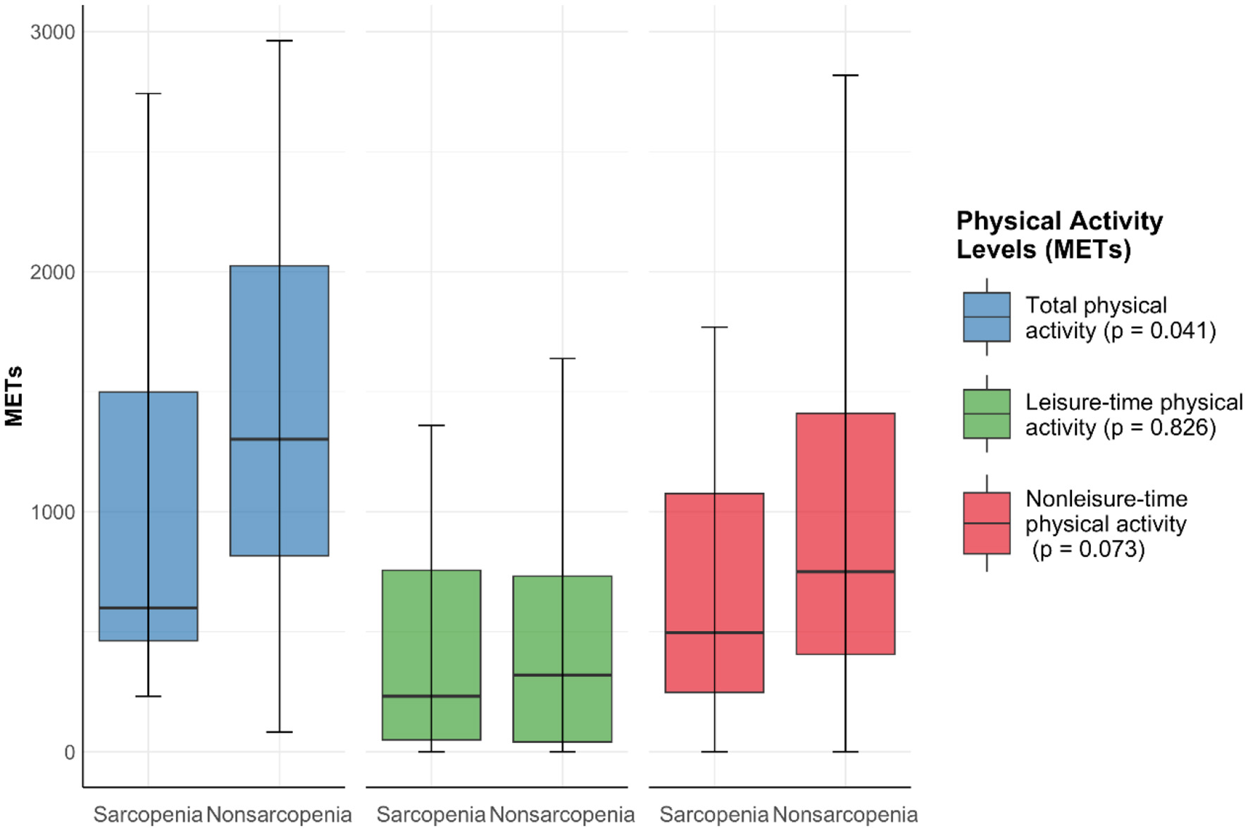 The total physical activity was 1,268 (687, 1,981) METs/week. The leisure-time and nonleisure-time physical activities were 300 (37, 740) and 724 (369, 1,338) METs/week, respectively. Nonsarcopenia patients exhibit higher physical activity levels than sarcopenia patients across all categories measured. They are more active in total physical activity (P = 0.041), leisure-time physical activity (P = 0.826), and nonleisure time physical activity (P = 0.073). However, there was no statistically significant difference in leisure-time physical activity and nonleisure-time physical activity between the two groups (Figure 2).
