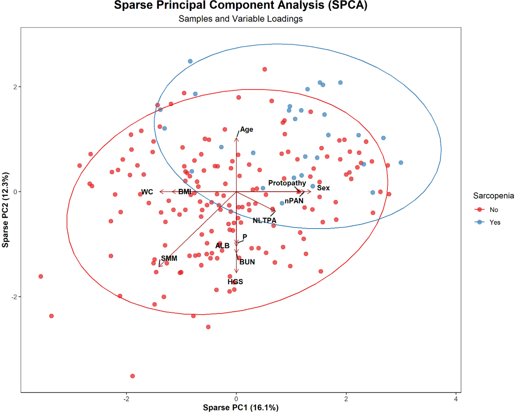 SPCA Bi-plot showing the distribution of sarcopenia and non-sarcopenia patients with key variable loadings.