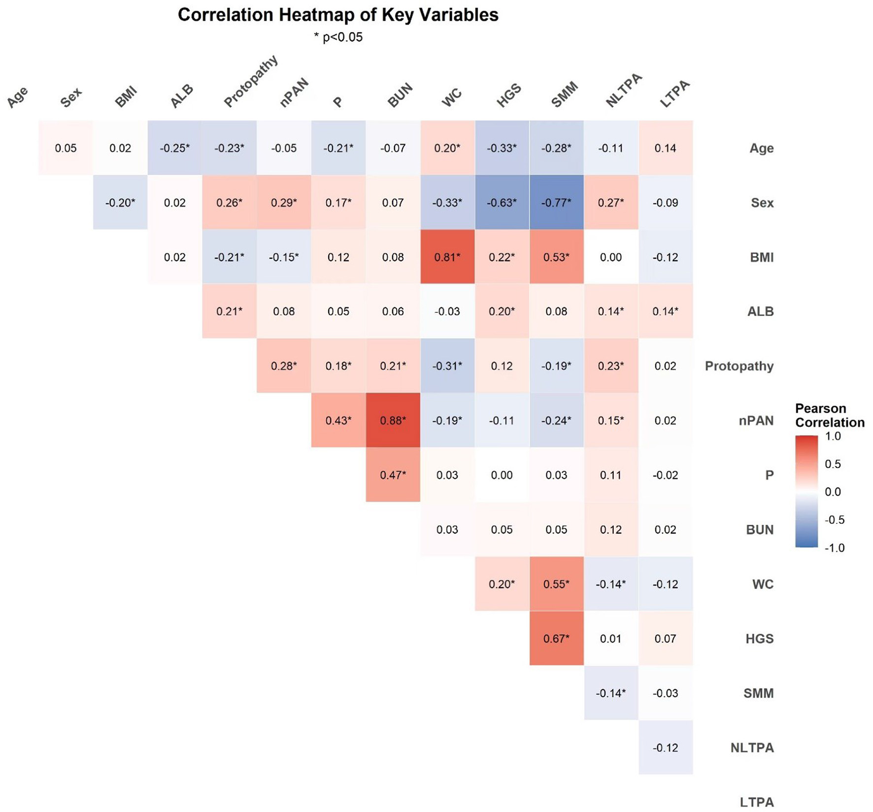 Data were analyzed using IBM SPSS Statistics version 25.0 (IBM Corp., Armonk, NY, USA). Normally distributed variables are presented as mean ± standard deviation (SD), non-normally distributed variables as median (interquartile range, IQR), and categorical data as frequencies and percentages. Between-group comparisons for continuous variables used independent t-tests, chi-square tests for categorical variables, and Mann–Whitney U-tests for non-normal data. Sparse Principal Component Analysis (SPCA) was used for dimensionality reduction and feature extraction. A bi-plot was generated to visualize variable loadings and patient distribution. Pearson's correlation analysis was performed to evaluate the relationships between variables. A correlation heatmap was generated to visually represent the strength and direction of the associations. Using modified Poisson regression analysis to explore the relationship between physical activity and the risk of sarcopenia. Using METs on the x-axis and relative risk on the y-axis to illustrate the dose-response relationship between METs of physical activity and the risk of sarcopenia. A two-sided P < 0.05 was considered statistically significant.