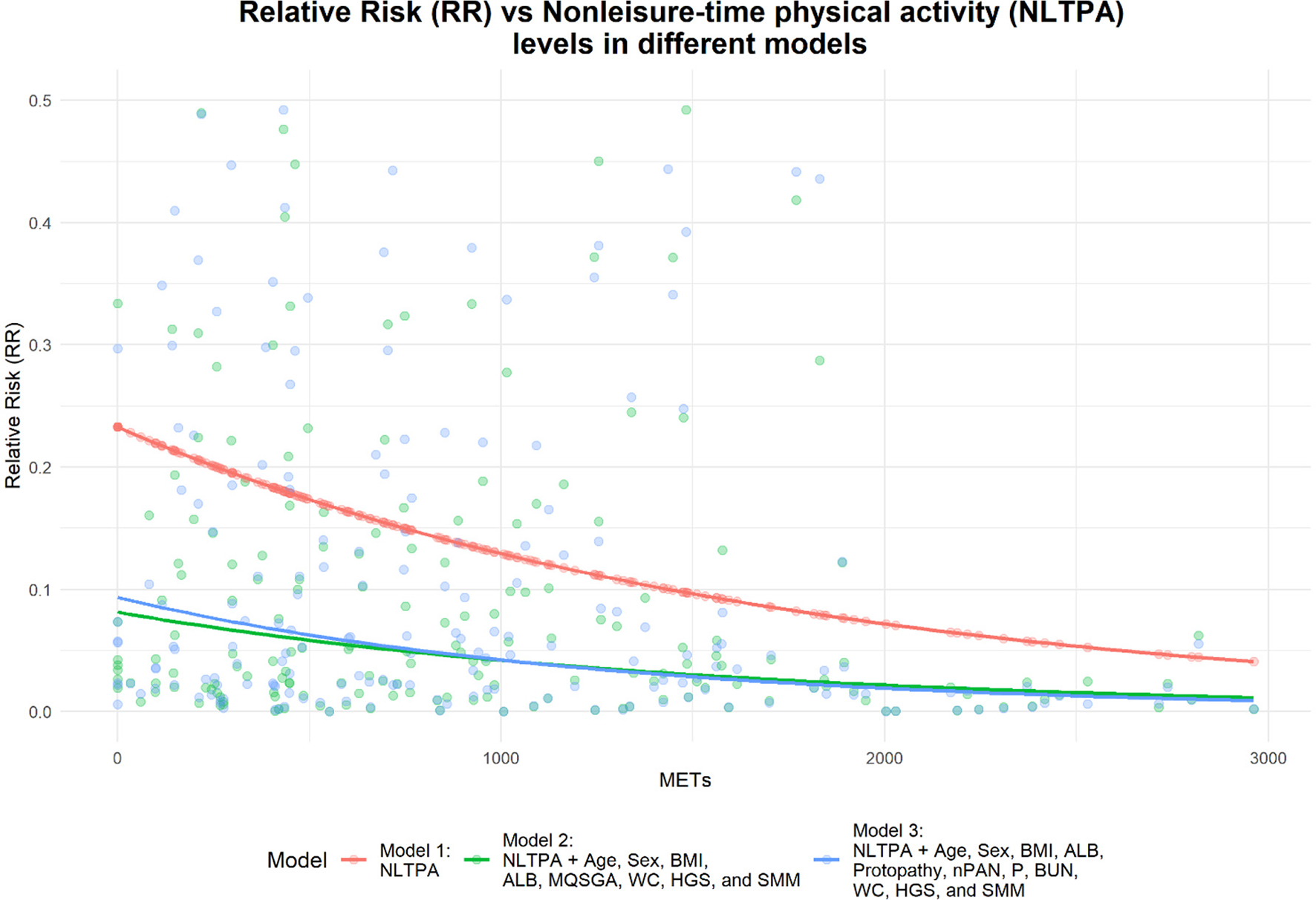 Among 196 adults, 67 (34.2%) and 112 (57.1%) actively participated in leisure-time and nonleisure-time physical activities, respectively (Table 2). Figure 4 presents a correlation heatmap illustrating the relationships between physical activity, demographic characteristics, nutritional indicators, biochemical markers, and muscle mass parameters in MHD patients. Using the inactive group as the control group for comparison, after adjusting for age, sex, BMI, ALB, MQSGA, WC, HGS, and SMM, active participation in both leisure-time and nonleisure-time physical activities negatively correlated with sarcopenia risk; however, only nonleisure-time physical activity was significantly associated with sarcopenia risk (P < 0.05). After further adjustment for age, sex, BMI, ALB, protopathy, nPAN, P, BUN, WC, HGS, and SMM, nonleisure-time physical activity was still negatively correlated with sarcopenia risk (nonleisure-time physical activity: RR = 0.449, 95% CI = 0.248–0.814, P < 0.05) (Table 3). Using nonleisure-time physical activity level as the X-axis and RR as the Y-axis, RR shows a decreasing trend as nonleisure-time physical activity increases (Figure 5).