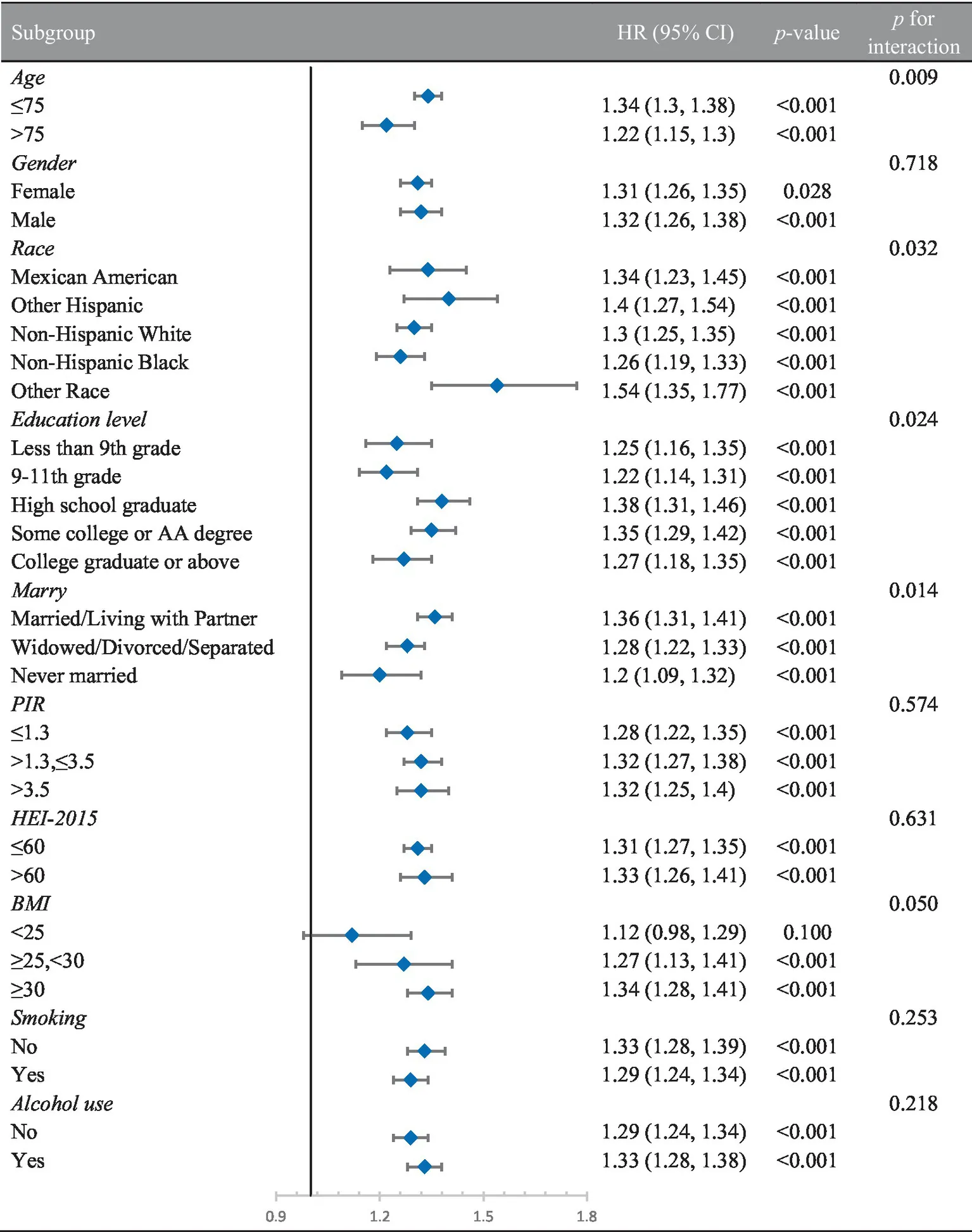ORa, odds ratio; 95% CIb, 95% confidence interval; Model1c, adjusted for non-covariates; Model2d, adjusted for age, gender, race, and education; Model3e, further adjusted for marry, poverty income ratio, smoking, alcohol use, systolic blood pressure, diastolic blood pressure, healthy eating index-2015 and energy intake.