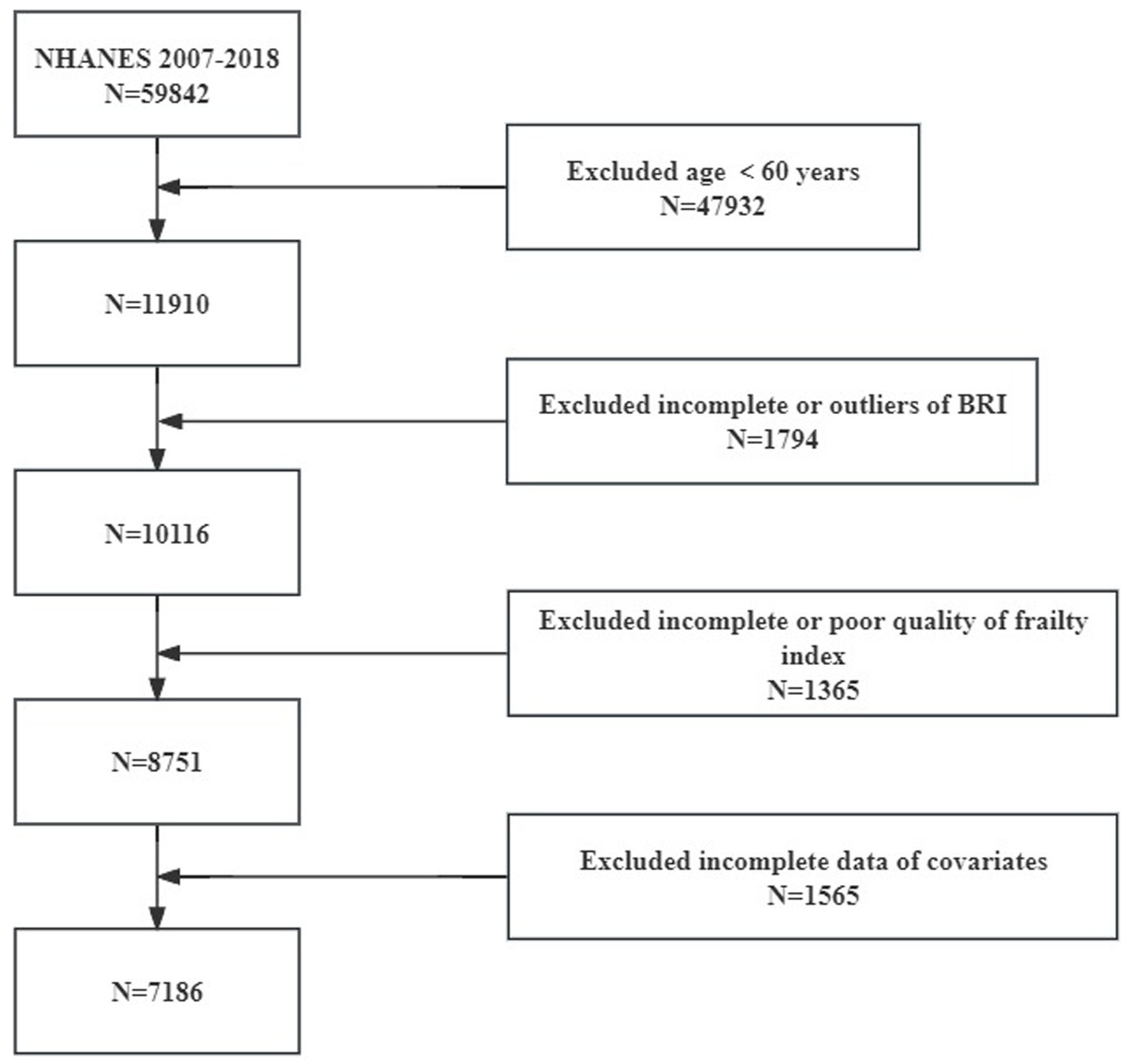 The National Centre for Health Statistics (NCHS) administers the NHANES, a nationwide study that evaluates the nutrition and health of American adults living outside of institutions using a stratified multistage sampling method. The data from this survey are accessible to the public, and all participants have given their written consent. Selected data from NHANES between 2007 and 2018 were used for the analyses in this article. Initially, data from 59,842 participants from the NHANES 2007–2018 period were considered. The final sample included 7,186 participants, excluding 47,932 people under the age of 60, 1,794 people with missing or abnormal BRI data, 1,365 people with unreliable frailty index assessments, and 1,565 people with missing covariates (Figure 1). To learn more about NHANES, go to the CDC website at: https://www.cdc.gov/nchs/nhanes/.