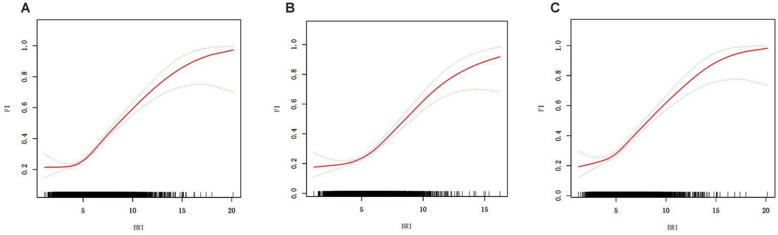 The findings of the weighted multivariate logistic regression analysis are summarized in Table 2. In model 1 (unadjusted), the prevalence of frailty increased 1.36 times for every unit rise in BRI (OR: 1.36, 95% CI: 1.30, 1.41; p < 0.0001); in model 2 (adjusted for age, sex, race, and education), the OR was 1.37 (95% CI: 1.31, 1.43; p < 0.0001). In fully adjusted model 3, the prevalence of frailty increased by 34% per 1-unit increase in BRI (OR: 1.34, 95% CI: 1.28, 1.40; p < 0.0001). Furthermore, Table 2 shows that the highest BRI group had a substantially higher prevalence of frailty than the lowest BRI group when BRI was classified (OR = 3.49, 95% CI: 2.83–4.30; p < 0.0001).