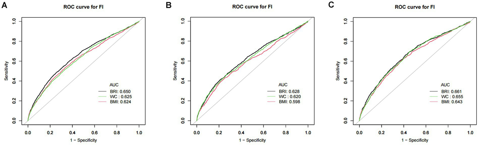 With the acceleration of global population aging, frailty has become particularly prominent in the elderly population (1). Frailty is a combined state accompanied by the decline of multiple physiological systems that significantly increases the risk of falls, disability, hospitalization, and even death (2). Obesity, particularly abdominal obesity, is widely recognized as one of the main risk factors for frailty. However, the traditional BMI, although widely used in the assessment of obesity (3), is deficient in distinguishing visceral fat from subcutaneous fat, making it difficult to accurately reflect the accumulation of abdominal fat (4), and therefore has limitations in measuring the impact of obesity on frailty. Waist circumference (WC) is a good indicator of abdominal fat accumulation, but it does not provide insight into fat distribution (5). The waist-to-hip ratio provides information on the distribution of abdominal fat, but it does not accurately assess fat metabolism or muscle mass (6). Especially in the elderly population, the lack of age- and gender-specific criteria limits its validity in the prediction of frailty.