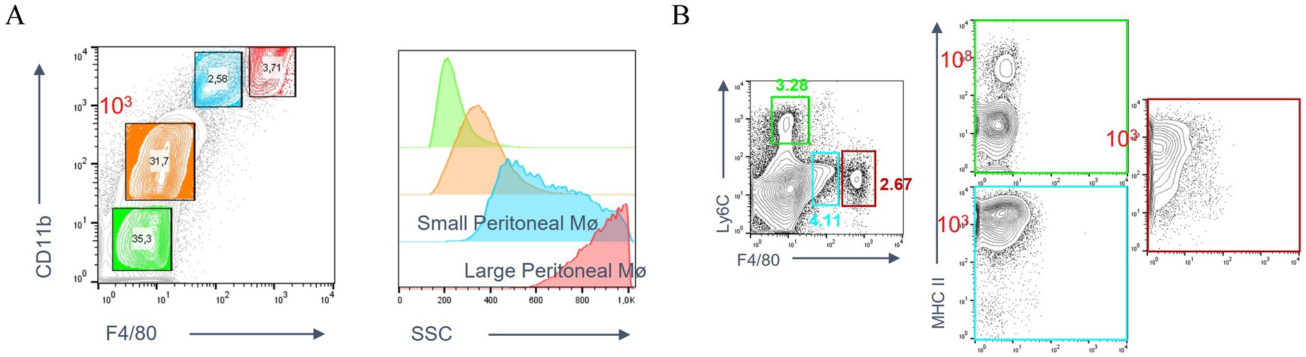Figure 1. Peritoneal macrophage subpopulations. (A) Definition of LPMs and SPMs populations based on the expression of CD11b and F4/80 using flow cytometry. (B) Expression of by Ly6c and MHC II on LPMs and SPMs.