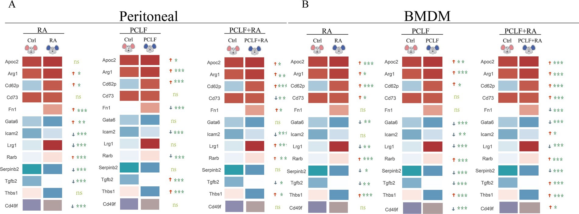 The same cultivation condition were employed to treat bone marrow-derived macrophages, and it was determined that Apoc2, Arg1, Cd62p, Cd73, Rarb, and Thbs1 were induced by RA. In the peritoneal lavage -treated group, an increase in the expression of Apoc2, Arg1, Cd62p, Cd73, Cd49f, Tgfb2, Thbs1, and Rarb was observed, indicating that the components in the peritoneal lavage may have a promotional effect on the expression of these genes in the BMDM (Figure 4B). The different effects of RA on peritoneal macrophages and BMDM may be related to their different origins and differentiation characteristics. LPMs, as peritoneal resident cells, may be more responsive to changes in local signaling molecules, whereas BMDM, due to their origin from myeloid cells, may be sensitive to systemic metabolic signals. These results further highlight the potential role of RA in regulating the function of different macrophage subpopulations.