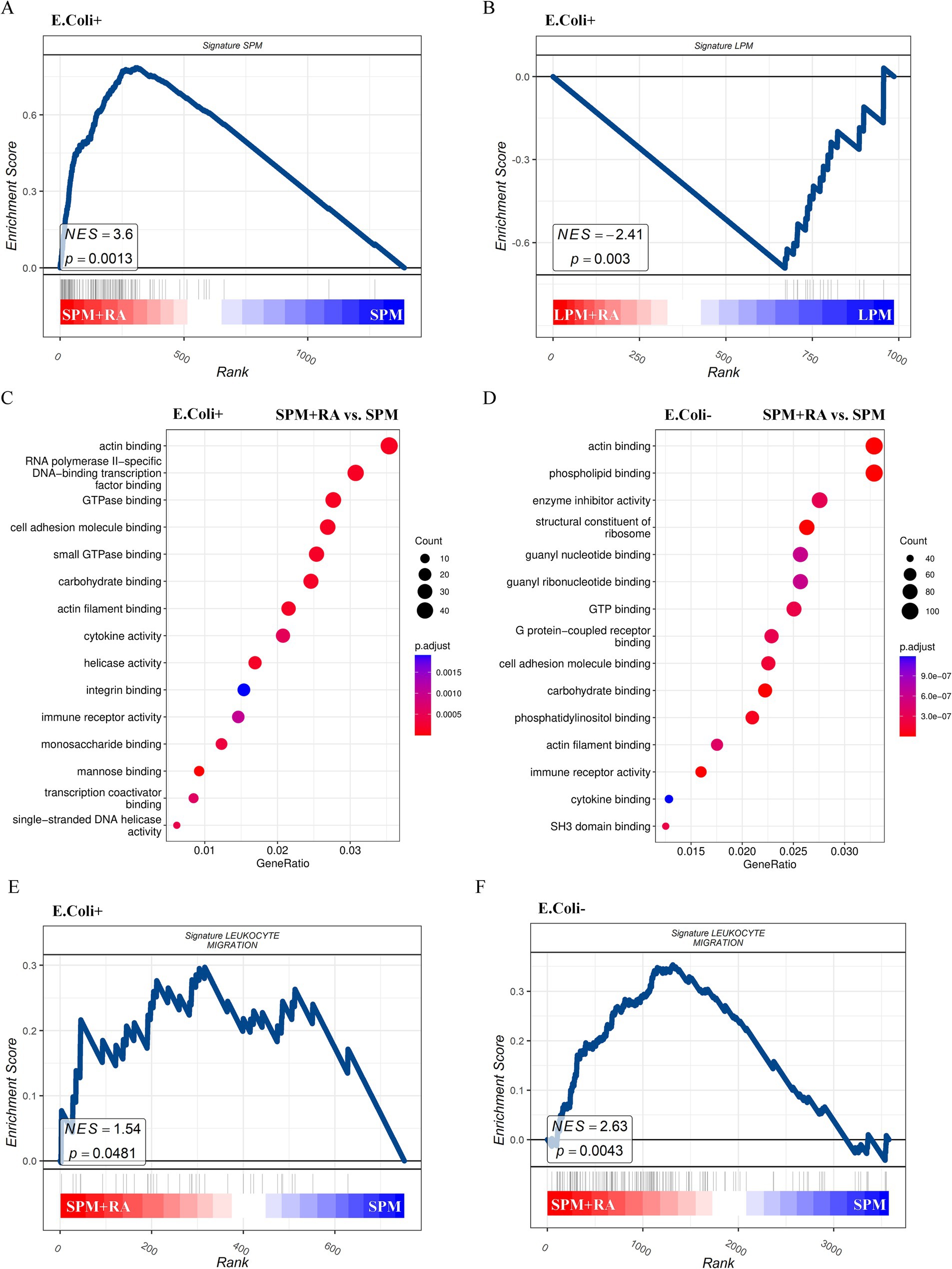 Figure 5. RA treatments promote the expression of genes of SPM signature as well as genes relevant to leukocyte migration. Gene set enrichment analysis (GSEA) visualization of gene signatures of SPM in the E. coli phagocytosing SPMs (A) and LPMs (B) treated with or without RA. GO enrichment analysis in the E. coli phagocytosing (C) or free (D) SPMs treated with vs. without RA. GSEA visualization of gene signatures of leukocyte migration in the E. coli phagocytosing (E) or free (F) SPMs treated with or without RA.