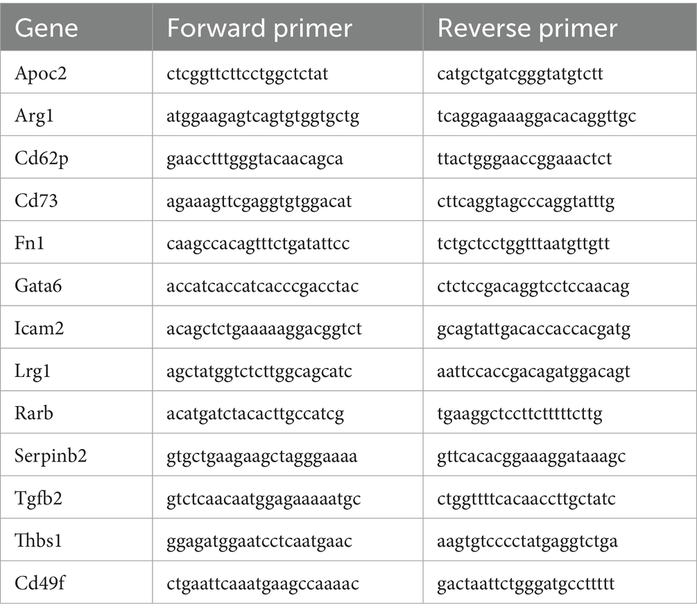 Peritoneal macrophages were extracted from the peritoneal cavity of mice. After 24 h of adhesion of macrophages to petri dish in complete medium containing 30% FBS, the macrophages were purified by washing away the non-adhesive cells and cultivated in serum-free basal medium supplemented with different drugs. For real-time PCR analysis, RNA was extracted using the TaKaRa RNAiso Plus kit. cDNA was reverse transcribed using Novozymes HiScript IV RT SuperMix for qPCR. Real-time PCR was performed on a QuantStudio5 detection system using SYBR green qPCR Master Mix (Table 1).