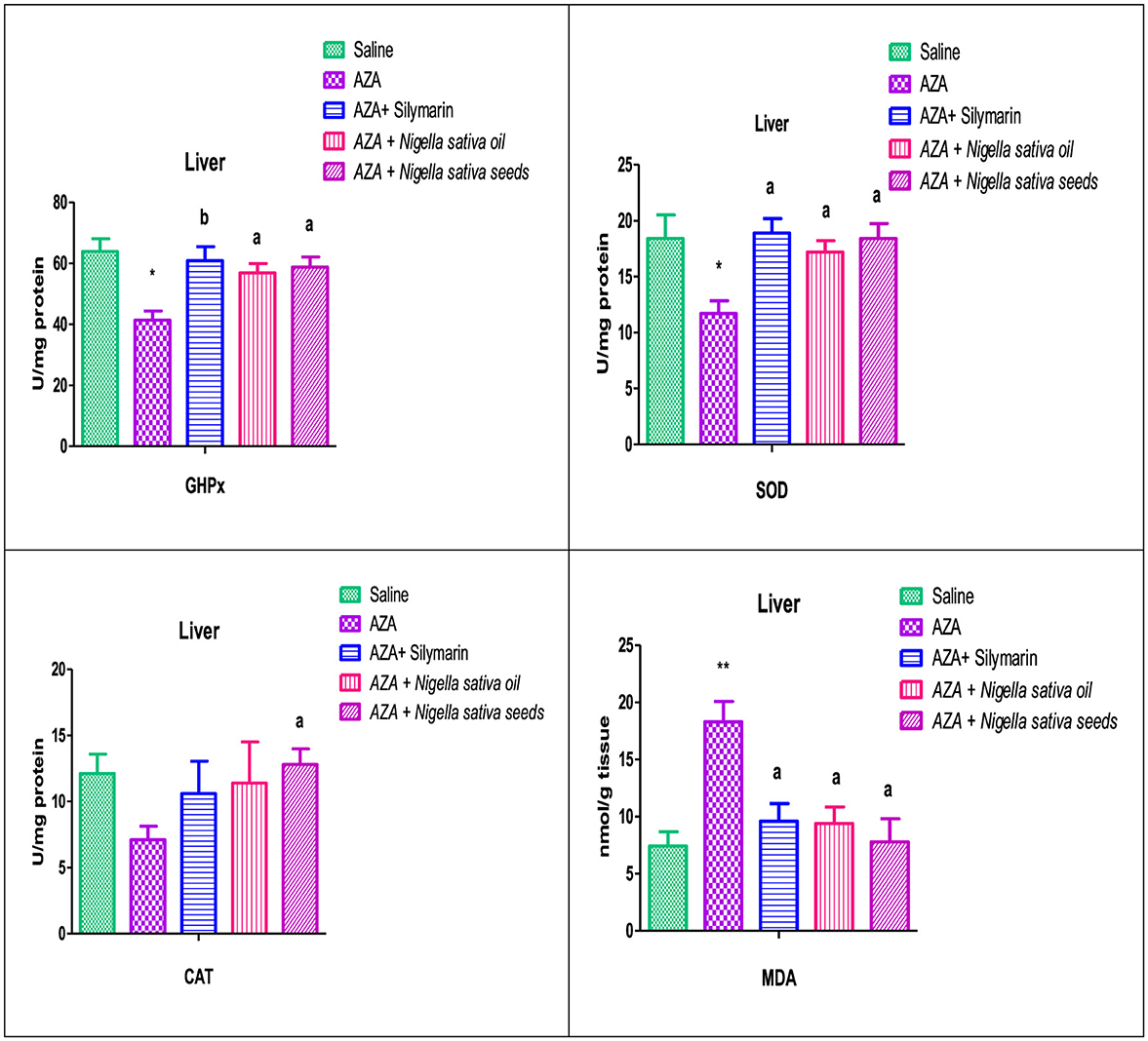 Figure 7. Effect of Nigella sativa oil and Nigella sativa seeds on liver tissue antioxidants (GHPx, glutathione peroxidase; SOD, superoxide dismutase; CAT, catalase) and lipid peroxidation (MDA, malondialdehyde). Bars denote means ± SE. The marks (*) and (**) are significantly P < 0.05 and P < 0.01 comparable to the saline negative control, respectively. The letters (a, b) are significantly P < 0.05 and P < 0.01 comparable to AZA (azathioprine) positive control, respectively.
