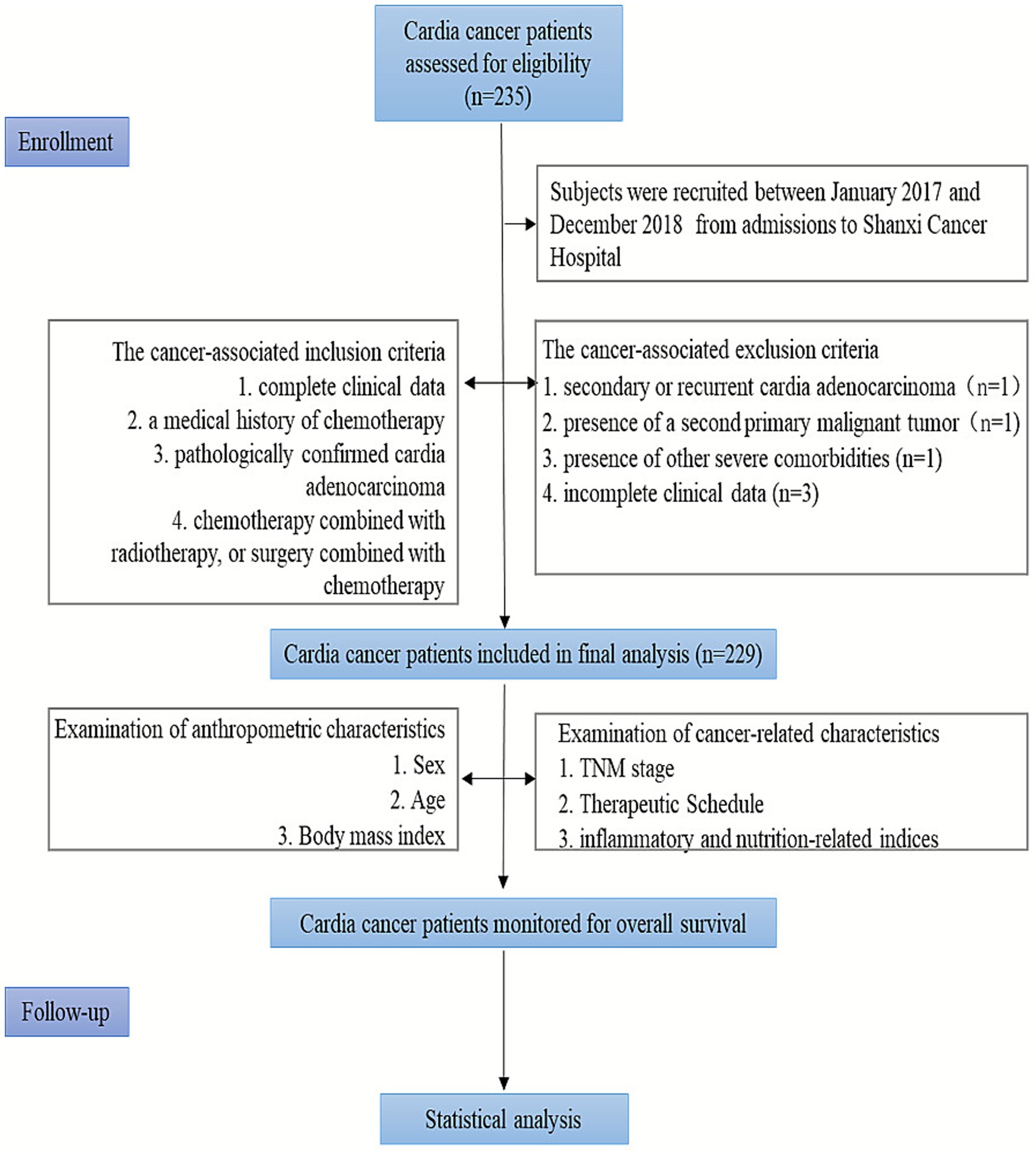 Data were collected from admissions to Shanxi Cancer Hospital between January 2017 and December 2018, comprising pre-treatment clinically relevant information for 229 patients with cardia cancer. Inclusion criteria: complete clinical data; pathologically confirmed cardia adenocarcinoma; a medical history of chemotherapy, chemotherapy combined with radiotherapy, or surgery combined with chemotherapy. Exclusion criteria: secondary or recurrent cardia adenocarcinoma; presence of a second primary malignant tumor; presence of other severe comorbidities; incomplete clinical data (Figure 1). This study was approved by the Ethics Committee of Shanxi Cancer Hospital (KY2023148).