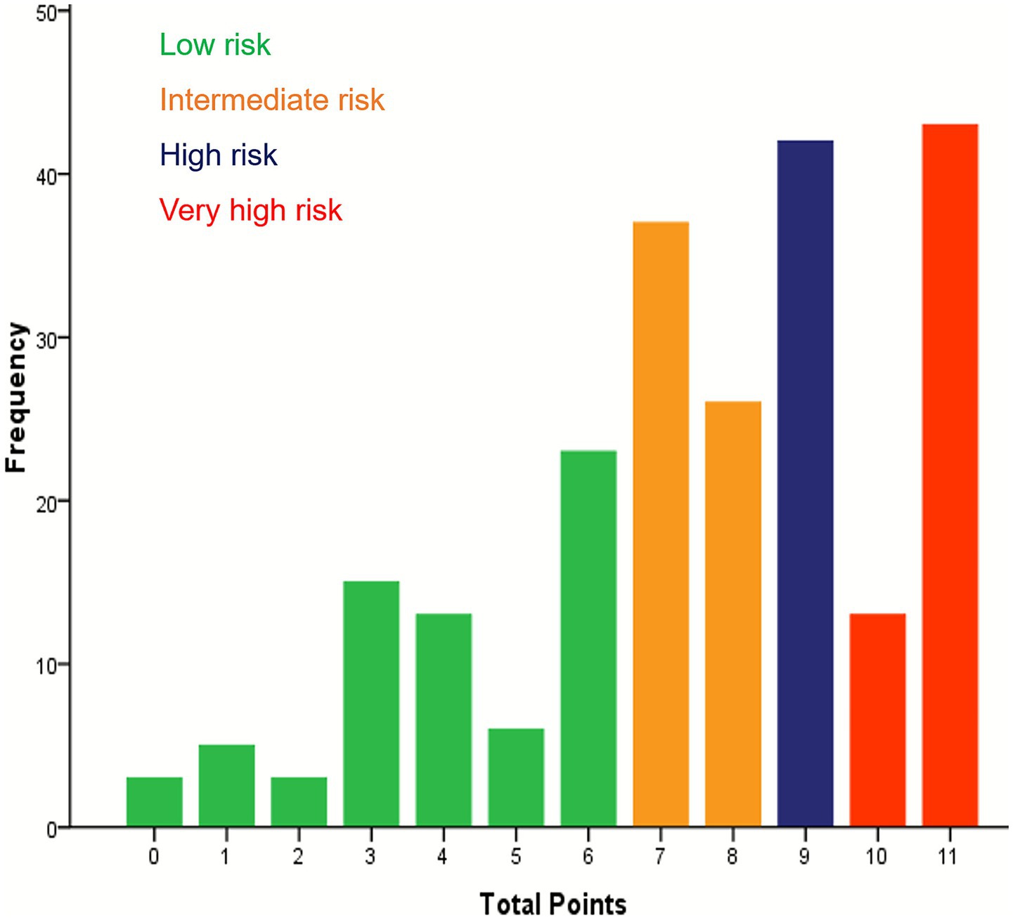 Figure 3. Showing the distribution of patients across the total sum of points and four risk groups in cardia cancer patients.