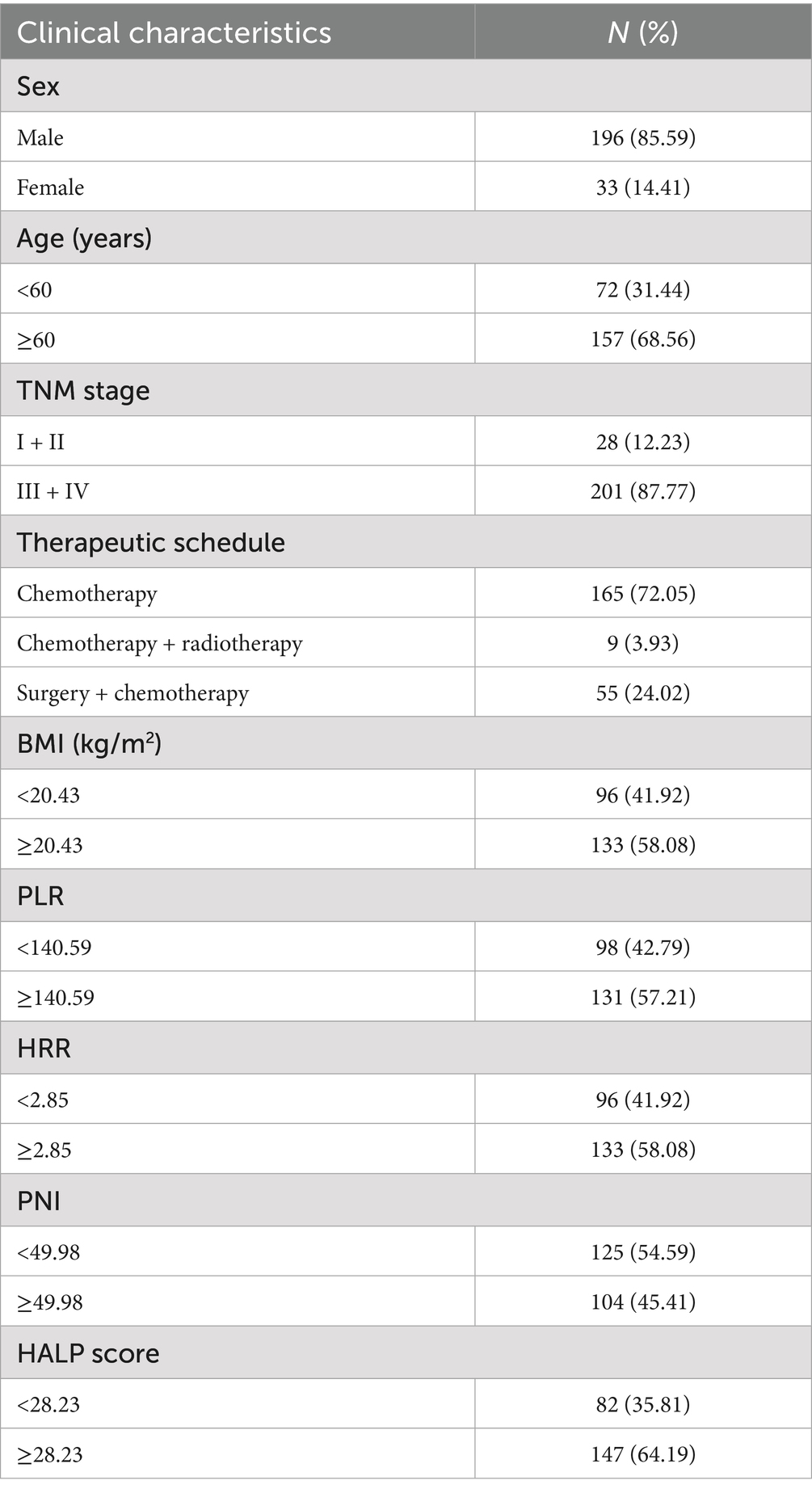 In the 229 patients, the optimal cut-off values for BMI, PLR, HRR, PNI, and HALP score were 20.43 kg/m2, 140.59, 2.85, 49.98, and 28.23, respectively. According to the optimal cut-off values, the distribution of inflammation and nutrition-related indexes was characterized by BMI < 20.43 kg/m2 in 96 cases and BMI ≥ 20.43 kg/m2 in 133 cases; PLR < 140.59 in 98 cases and PLR ≥ 140.59 in 131 cases; HRR < 2.85 for 96 cases and HRR ≥ 2.85 for 133 cases; PNI < 49.98 for 125 cases and PNI ≥ 49.98 for 104 cases; HALP score < 28.23 for 82 cases and HALP score ≥ 28.23 for 147 cases (Table 1).