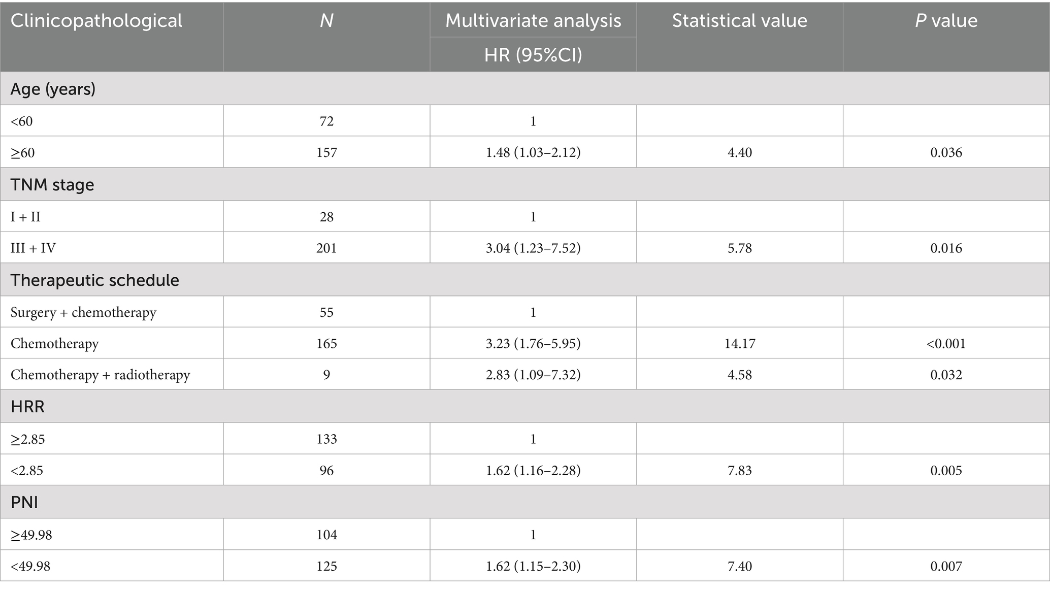 Univariate analysis revealed that patients younger than 60 years, those with stage I/II disease, those receiving comprehensive treatment including surgery, and those with high BMI, low PLR, high HRR, high PNI, and high HALP score had better prognoses. Multivariate Cox analysis further identified age, TNM stage, treatment regimen, HRR, and PNI as independent factors influencing the prognosis of patients with cardia cancer.