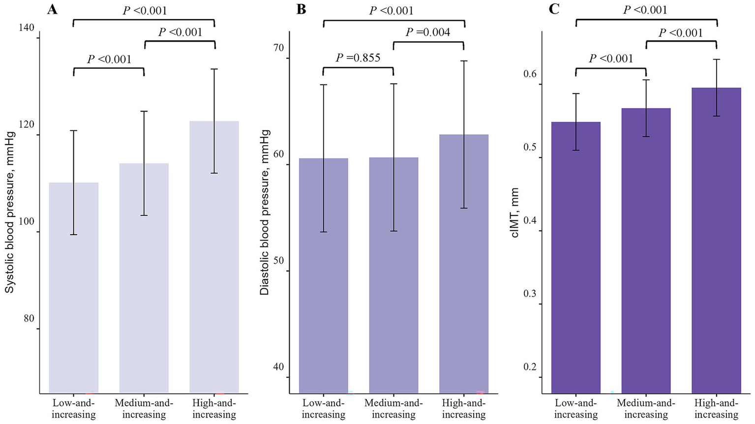 Compared to the low-and-increasing group (systolic BP [SBP]: 110.16 mmHg, diastolic BP [DBP]: 60.59 mmHg, cIMT: 0.549 mm), the medium-and-increasing group exhibited higher SBP (114.14 mmHg) and cIMT (0.567 mm) at the last follow-up. The high-and-increasing group showed even higher levels of SBP (122.85 mmHg), DBP (62.83 mmHg), and cIMT (0.595 mm) (all p < 0.05, Figure 2).
