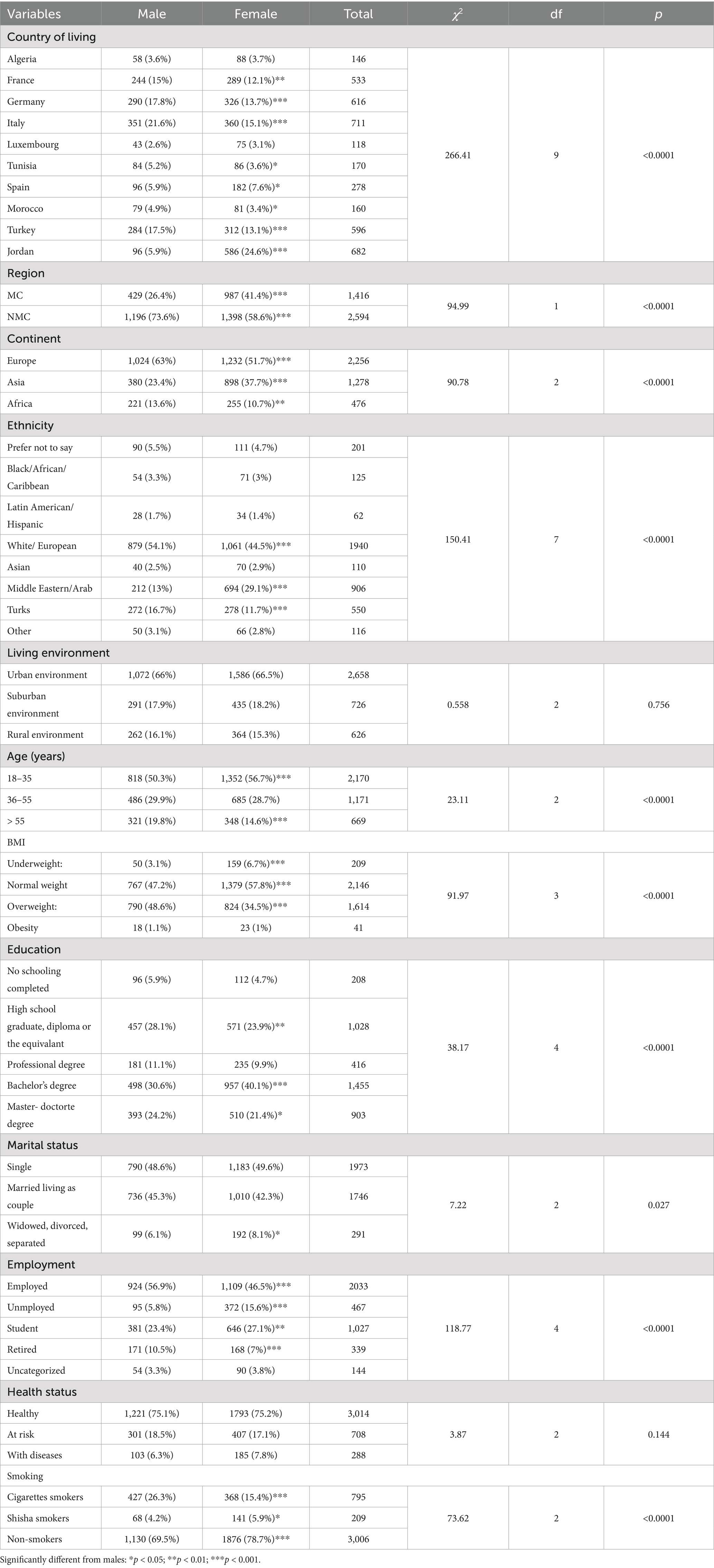 The demographic characteristics of the participants are presented in Table 1. The majority resided in urban areas, with no statistically significant gender-based difference in residential distribution (p = 0.756). However, a pronounced gender disparity was observed in continental representation (p < 0.001). Participants of both genders were predominantly from Europe (p < 0.001), with a higher proportion among males (p < 0.001) compared to females. Females had higher presentiveness in Asia (p < 0.001) and Africa (p < 0.01). Ethnic background also showed significant gender differences (p < 0.001). The most represented ethnic group was White/European, with a significantly higher proportion among males compared to females. This was followed by Middle Eastern/Arab participants, where females were more represented, and Turks participants, with a significantly higher proportion among males (p < 0.001).