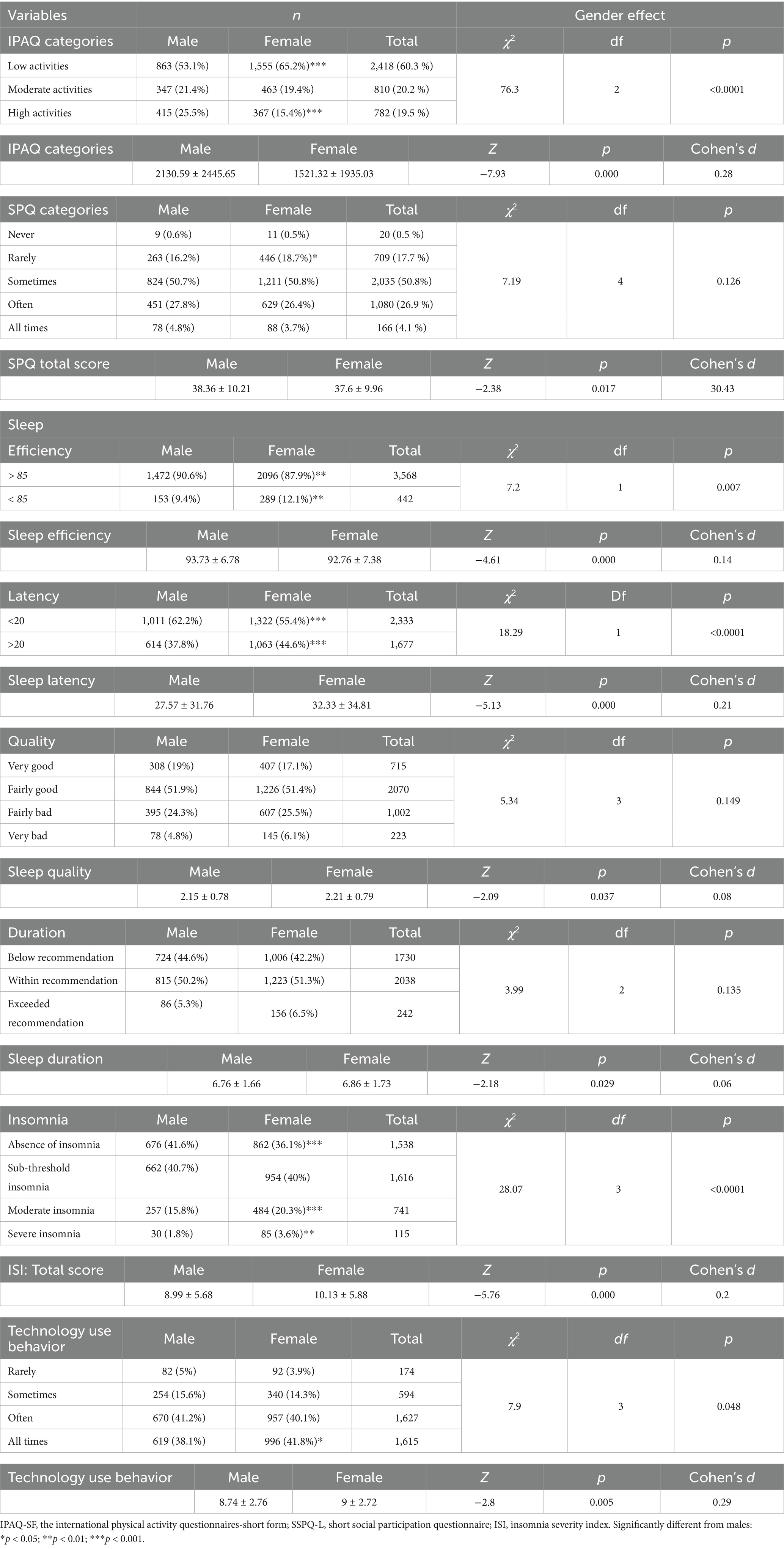 The Mann–Whitney test revealed that males had significantly higher IPAQ-SF scores than females (Z = −7.93, p < 0.001, Cohen’s d = 0.28), and scored higher on the SSPQ (Z = −2.38, p = 0.017, Cohen’s d = 3.43) indicating greater PA and social participation among this population. Regarding sleep patterns, males exhibited higher sleep efficiency (Z = −4.61, p < 0.001, Cohen’s d = 0.14), whereas females showed longer sleep latency (Z = −5.13, p < 0.001, Cohen’s d = 0.21), poorer sleep quality (Z = −2.09, p = 0.037, Cohen’s d = 0.08), longer sleep duration (Z = −2.18, p = 0.029, Cohen’s d = 0.06), and higher ISI scores (Z = −5.76, p < 0.001, Cohen’s d = 0.2). Females also reported higher overall technology use behavior (Z = −2.8, p = 0.005, Cohen’s d = 0.29) (Figure 2).