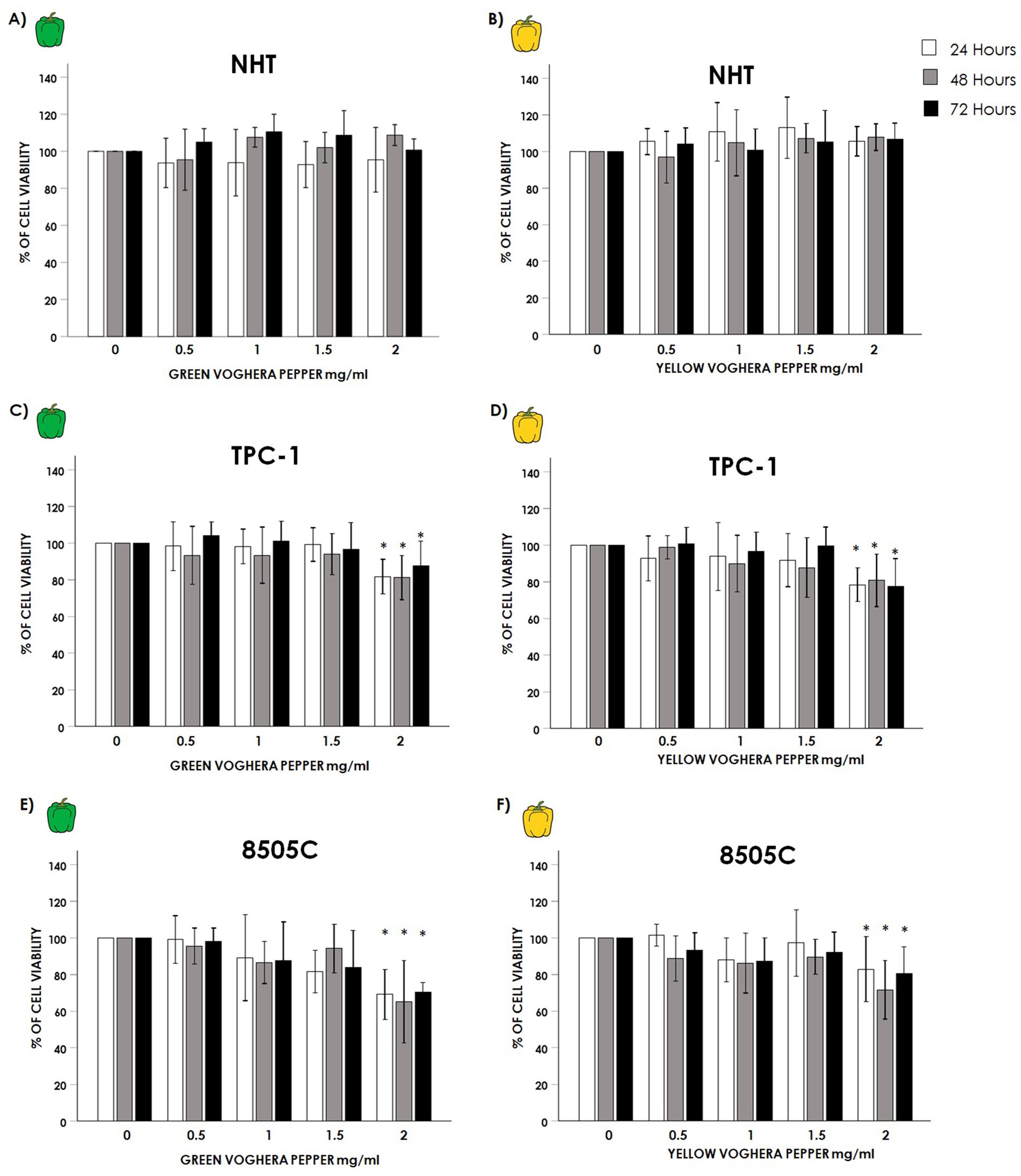 Figure 1. Effect of Voghera pepper extracts on thyroid cell viability. Results of WST-1 employed to assess changes in viability on NHT, TPC-1 and 8505C cells. Bar graphs: y-axis indicates the % of cell viability; x axis indicate the concentrations of Voghera peppers’extracts (mg/mL). Bars show the effect of Green Voghera pepper (GVP) or Yellow Voghera pepper (YVP) after 24 (white bars), 48 (gray bars) and 72 h (black bars). Panels (A,B) show the % of cell viability after treating NHT cells with increasing concentration of GVP (A) or YVP (B). Panels (C,D) show the % of cell viability after treating TPC-1 cells with increasing concentration of GVP (C) or YVP (D). Panels (E,F) show the % of cell viability after treating 8505C cells with increasing concentration of GVP (E) or YVP (F). Bars represent the mean ± SD of normalized values. Control (0 mg/mL) values were set to 100% after normalization; as a result, SD is not shown for control bars. Results were expressed as % of cell viability relative to control. Significant changes between treated samples vs. controls were indicated by *.
