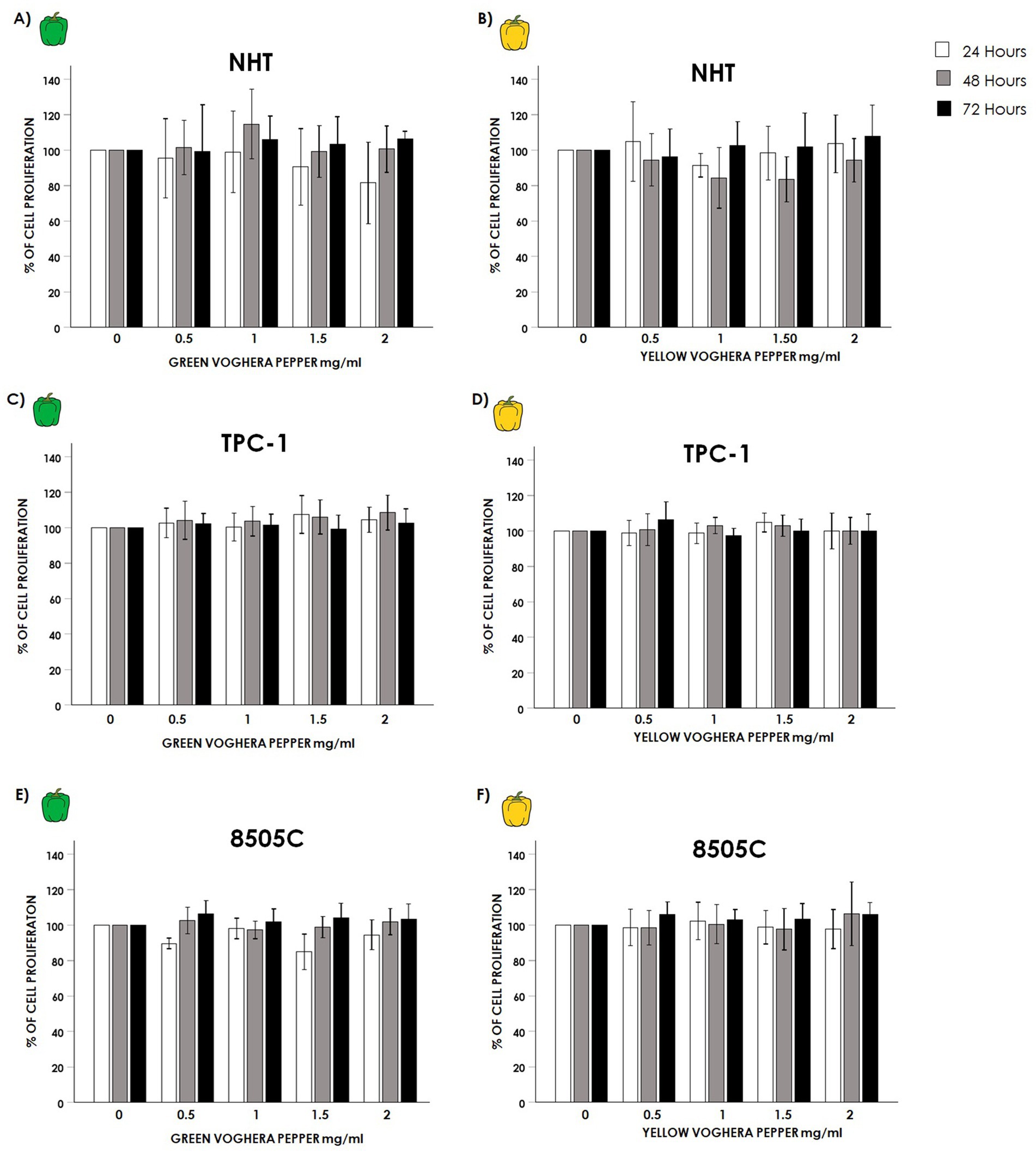Figure 2. Effect of Voghera pepper extracts on thyroid cells proliferation. Results of crystal violet assay employed to assess changes in the proliferation of thyroid cells. Bar graphs: y-axis indicates the % of cell proliferation; x-axis indicate the concentrations of Voghera peppers (mg/mL). Bars show the effects of Green Voghera pepper (GVP) or Yellow Voghera pepper (YVP) after 24 (white bars), 48 (gray bars) and 72 h (black bars) on cell proliferation. Panels (A,B) show the % of cell proliferation after treating NHT cells with increasing concentrations of GVP (A) or YVP (B). Panels (C,D) show the % of cell proliferation after treating TPC-1 cells with increasing concentration of GVP (C) or YVP (D). Panels (E,F) show the % of cell proliferation after treating 8505C cells with increasing concentration of GVP (E) or YVP (F). Bars represent the mean ± SD of normalized values. Control (0 mg/mL) values were set to 100% after normalization; as a result, SD is not shown for control bars. Results were expressed as percentage of cell proliferation relative to control. Significant changes between treated samples vs. controls were indicated by *.
