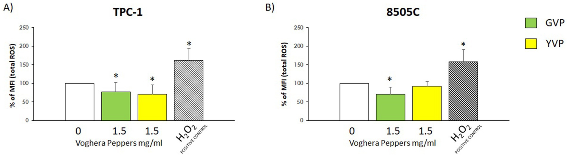 Figure 3. Effect of Voghera pepper extracts on ROS production in non-stressed conditions. Results derived through Fluorescence-activated cell sorting (FACS). Bar graphs: y-axis indicates the % of the mean of fluorescence intensity (MFI) total ROS; x-axis indicates treatment with Voghera peppers (0 or 1.5 mg/mL, for 24 h). Bars show the effect of Green Voghera pepper (GVP) (green bars) and the effect of Yellow Voghera pepper (YVP) (yellow bars) on total ROS production. Panel (A) shows the effect of Voghera peppers on total ROS production (in terms of changes of % of control) in TPC-1 after 24 h of treatment with GVP or YVP. Striped bar indicates the treatment with H2O2 that served as positive control for ROS production by TPC-1. Panel (B) shows the effect of Voghera peppers on total ROS production (in terms of changes of % of control) in 8505C after 24 h of treatment with GVP or YVP. Striped bar indicates the treatment with H2O2 that served as positive control for ROS production by 8505C. Bars shows MFI values that were normalized to those of untreated control cells, set as 100%, and expressed as percentage of ROS relative to control (0). Bars represent the mean ± SD of normalized values. Control values were set to 100% after normalization; as a result, SD is not shown for control bars. Significant changes between treated samples vs. controls were indicated by *.