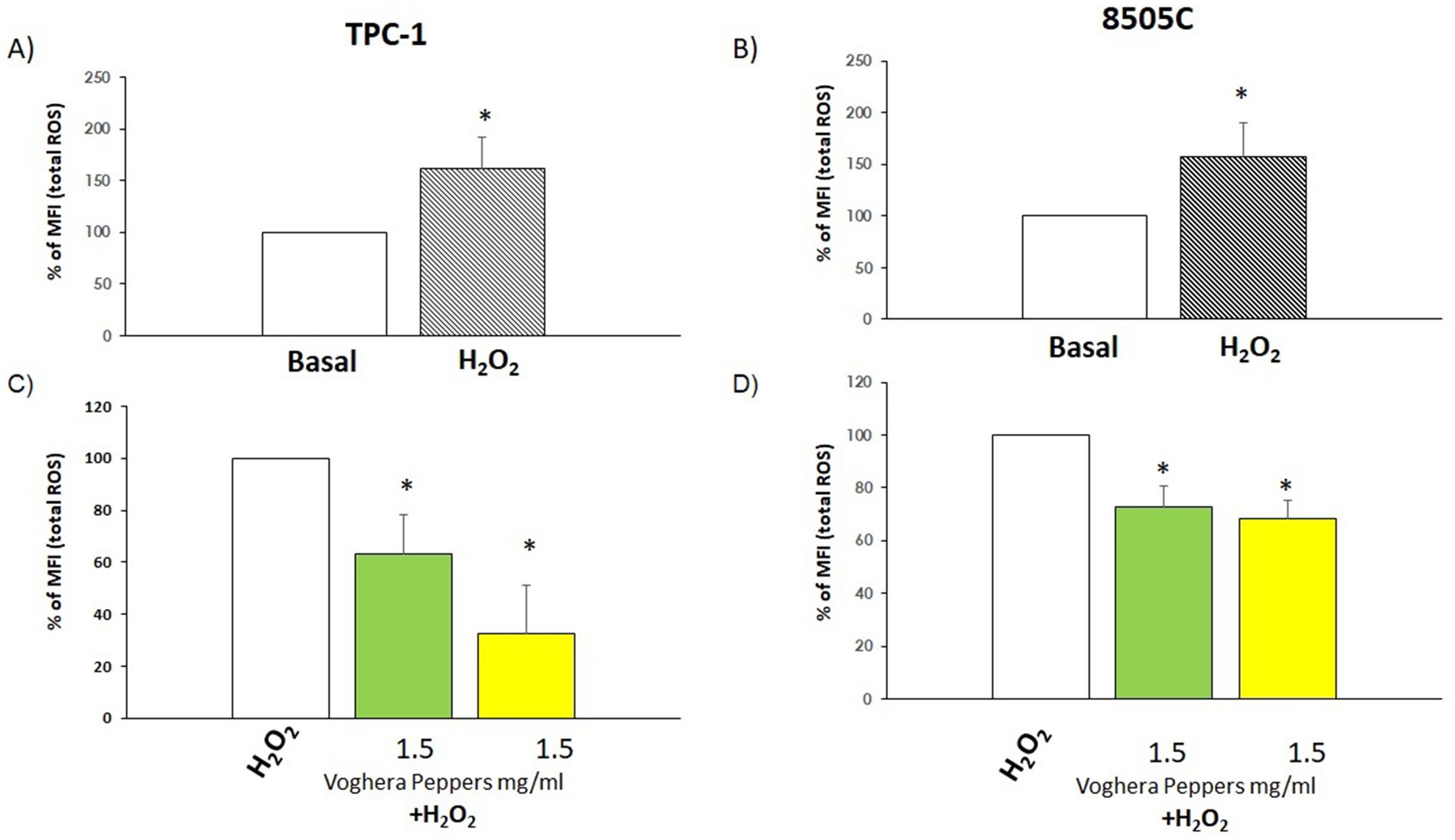 Figure 4. Effect of Voghera pepper extracts on ROS production in stressed conditions (combination with H2O2). Results derived through Fluorescence-activated cell sorting (FACS). Bar graphs: y-axis indicates the % of the mean of fluorescence intensity (MFI); (A,B) X-axis indicates basal ROS production in thyroid cancer cells (white bar) and a ROS increase after exposure to H2O2. Results are expressed as percentage % calculated on the MFI of untreated samples. (C,D) X-axis indicates treatment with GVP (green bar) or YVP (yellow bar) in combination with H2O2. White bar indicate treatment with H2O2 alone. Bars shows the percentage of mean of Fluorescence Intensity (MFI). Bars shows MFI values that were normalized to those of H2O2 treated control cells, set as 100%, and expressed as percentage of ROS relative to H2O2 treated control. Bars represent the mean ± SD of normalized values. Control values were set to 100% after normalization; as a result, SD is not shown for control bars. Significant changes between treated samples vs. controls were indicated by *.