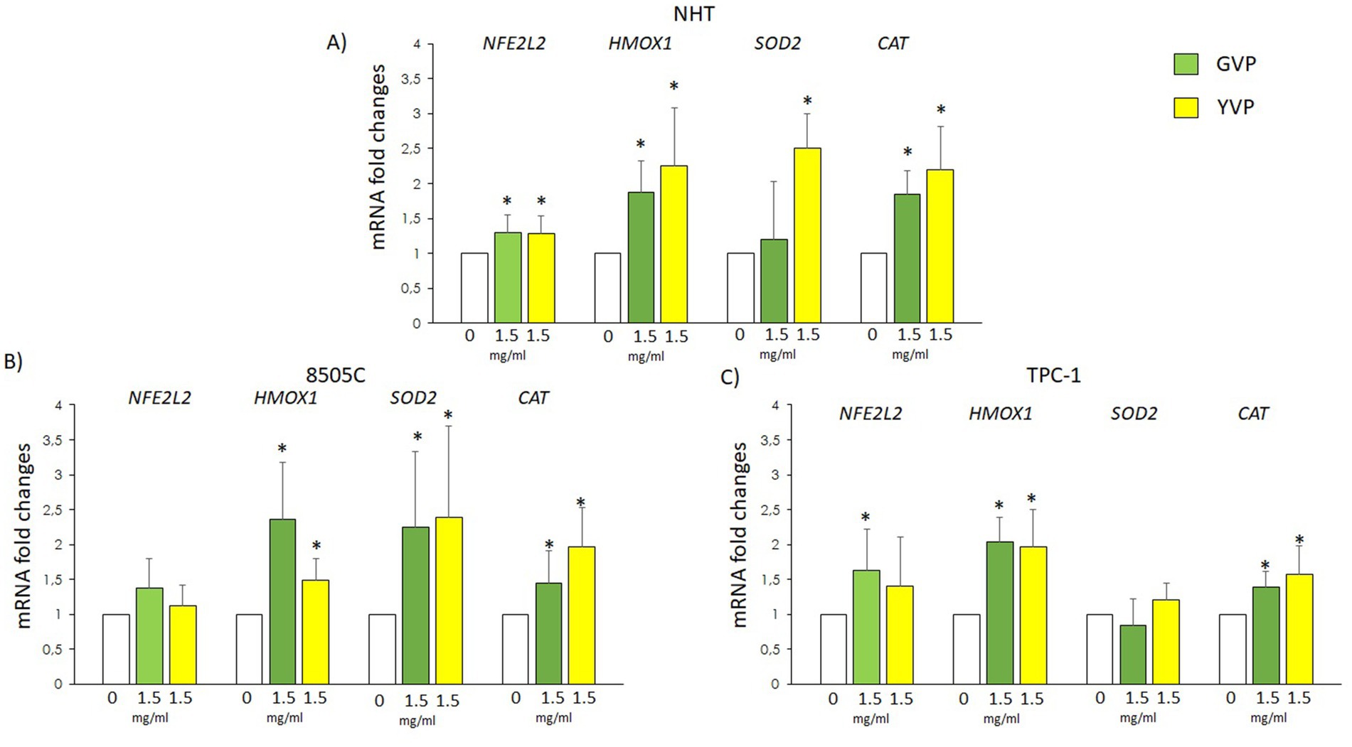 Figure 5. Effect of Voghera pepper extracts on mRNA levels of oxidative stress related genes in thyroid cells. Results of RT-PCR experiments in NHT (A), 850C (B) and TPC-1 (C) cells treated with Voghera peppers at 0 (white bars) or 1.5 mg/mL for 24 h. Bar graphs: y-axis indicates the fold changes in the mRNA levels of NFE2L2, HMOX1, SOD2 and CAT normalized for GAPDH and analyzed using the ΔΔCt method (further normalized for untreated samples, see Material and methods); x-axis indicate treatments, where Green bars represent treatment with Green Voghera pepper (GVP) and Yellow bars represent treatment with Yellow Green pepper (YVP). Significant changes between treated samples vs. controls were indicated by *.