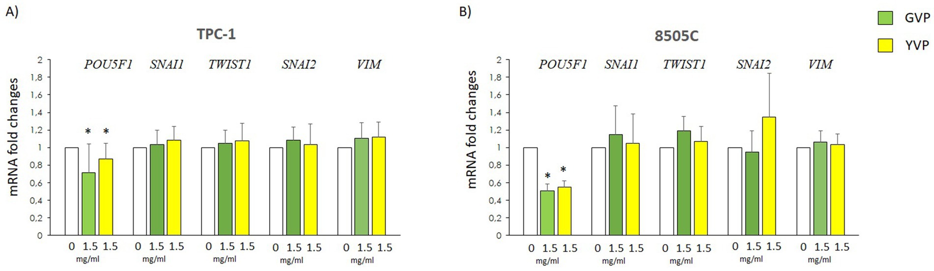 Bar charts displaying mRNA fold changes for genes POU5F1, SNAI1, TWIST1, SNAI2, and VIM in TPC-1 and 8505C cells. Both graphs compare control, GVP (green), and YVP (yellow) treatments at 0 and 1.5 mg/ml. Asterisks indicate significant differences from controls for POU5F1 in both cell types.
