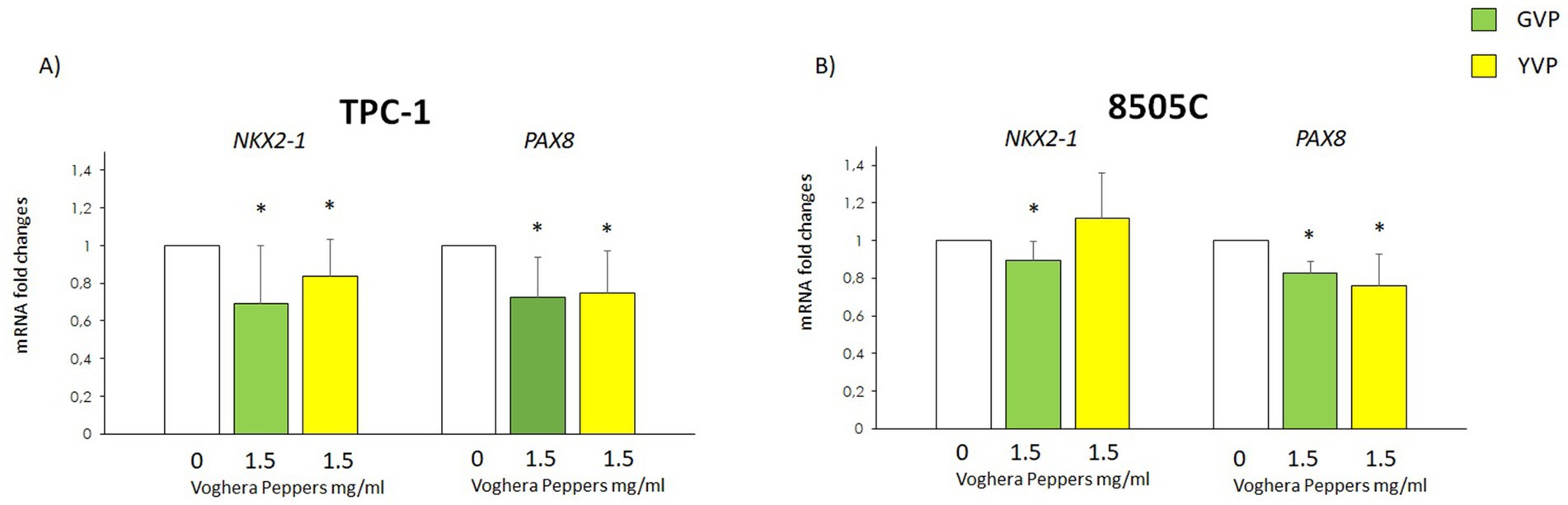 Figure 7. Effect of Voghera pepper extracts on mRNA levels of NKX2-1 and PAX8. Results of RT-PCR experiments in TPC-1 (A) and 850C (B) cells treated with Voghera peppers at 0 (white bars) or 1.5 mg/mL for 24 h. Bar graphs: y-axis indicates the fold-changes in mRNA levels of NKX2-1 and PAX8 normalized for GAPDH and analyzed using the ΔΔCt method (further normalized for untreated samples, see materials and methods). The x-axis indicates treatments: Green bars represent treatment to Green Voghera pepper (GVP); Yellow bars represent treatment to Yellow Green pepper (YVP). Bars show results of RT-PCR. Significant changes between treated samples vs. controls were indicated by *.