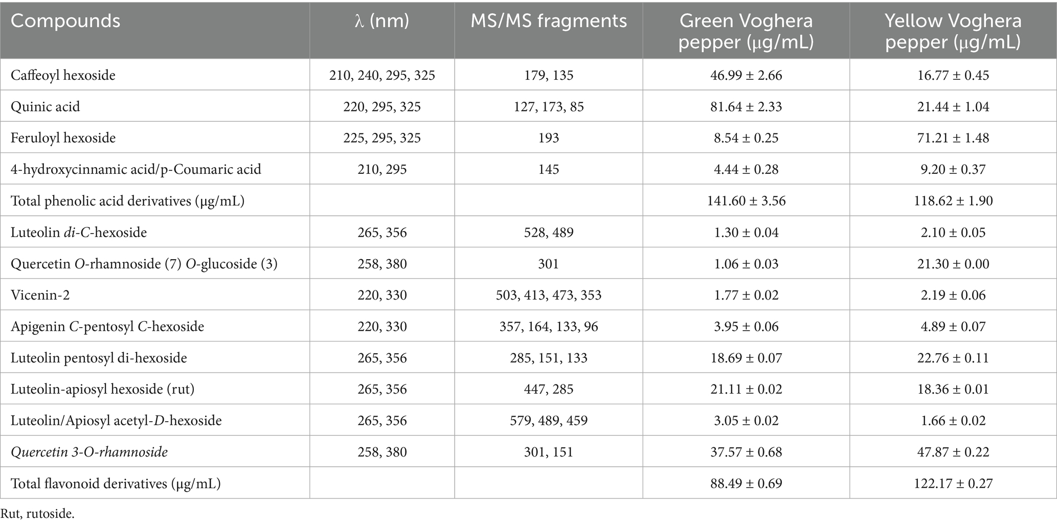 Green and yellow sweet peppers were selected as models of early and mid-stage ripening (provided by the Istituto Tecnico Agrario “C. Gallini of Voghera” (PV) and the PepeVo association). The extraction procedure was performed as previously reported (17, 19, 20). Briefly, 15 g of pepper were left in 100 g mixture 1,2-propanediol/water (55 and 45%, respectively) for 2 h at 40 °C. Subsequently, samples were homogenized for 15 min and left to macerate at 40 °C for 2 h. The sample was left to rest for 24 h to allow the solid part to settle, and the supernatant, containing the full range of phenolic acid derivatives and flavonoids extracted from the grams of pepper used, was collected. Subsequently, the extracts were filtered using 0.22 μm filters to ensure an adequate level of sterility for the subsequent analyses, obtaining an extract with a concentration of Voghera pepper or pepper waste equivalent to 0.15 g/mL in a 1,2-propanediol/water mixture. For the characterization of phenolic acid derivatives and flavonoids, extract samples were diluted 1:1 in Dimethyl Sulphoxide (DMSO) and placed in a vial for chromatographic analysis, each measurement was performed in triplicate to ensure the reliability of the results. The solutions were then analyzed using the LC-DAD-MS system composed by an Agilent 1,260 chromatograph equipped with autosampler, diode array series 1,260. At the end of the chromatographic column a “t” junction was used to split the flow equally to Diode Array and Mass spectrometric detector. A Varian MS 500 Ion Trap mass spectrometer was used operating with an Electrospray Ion source collecting data in negative and positive ion mode. The nebulizer gas was Air in negative ion mode and Nitrogen in positive ion mode; the drying gas was nitrogen. Pressure of drying gas was set at 25 psi and nebulizer at 30 psi. Needle was set to 4,500 V, and capillary was set to 80 V. Rf loading was 85% and the data were obtained using the turbo data depending on scan of the instrument that allows the generation of fragmentation tree of ionic species that reach a threshold current value. For the chromatographic separation, an Eclipse XDB C-18 4.6×250 mm 5 μm column was used as the stationary phase. Using a mobile phase composed of a mixture of water with 1% formic acid (A), acetonitrile (B), and methanol (C), the following elution gradient was employed: 0–0.5 min 95:5:0 (A:B:C); 5 min 85:15:0 (A:B:C); 15 min 60:30:10 (A:B:C); 20 min 20:70:10 (A:B:C); 25 min 0:90:10 (A:B:C); 43 min 0:90:10 (A:B:C); 44 min 95:5:0 (A:B:C) flow rate was 400 μL/min. The identification of the detected compounds was carried out based on literature data and fragmentation patterns. UV spectra were acquired at wavelengths of 330, 350, and 254 nm. Rutin and chlorogenic acid were used as reference standards for the general quantification of flavonoids and phenolic acids, respectively. Solutions of reference compounds were prepared in four concentrations (100 μg/mL, 50 μg/mL, 20 μg/mL, 2 μg/mL) and calibration curves were obtained at 350 nm for rutin and 330 nm for chlorogenic acid. Peaks were assigned to flavonoid or chlorogenic acid derivatives on the basis of the UV spectrum and MS data. The data were expressed in μg/mL and reported in the table as mean ± SD of the three replicates.